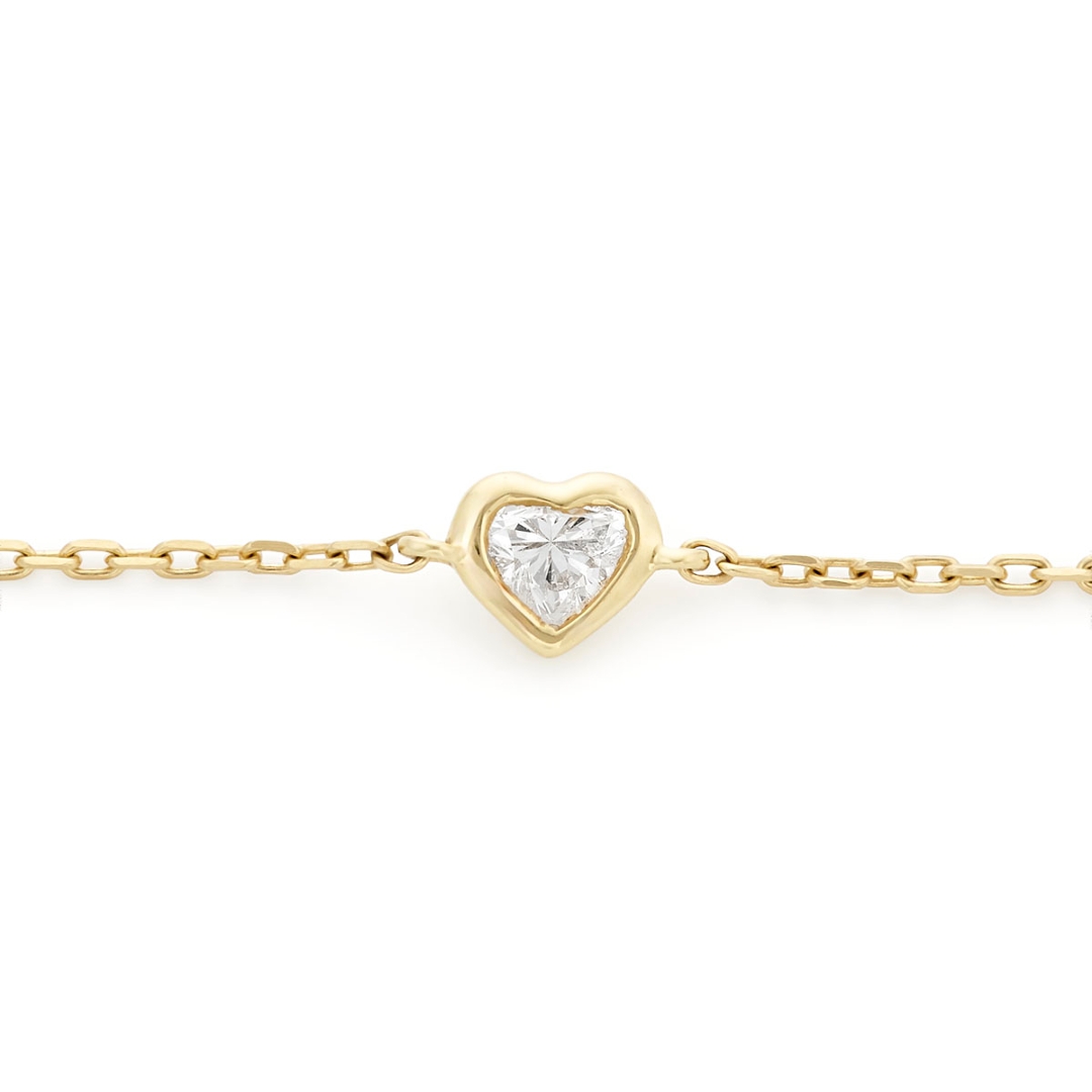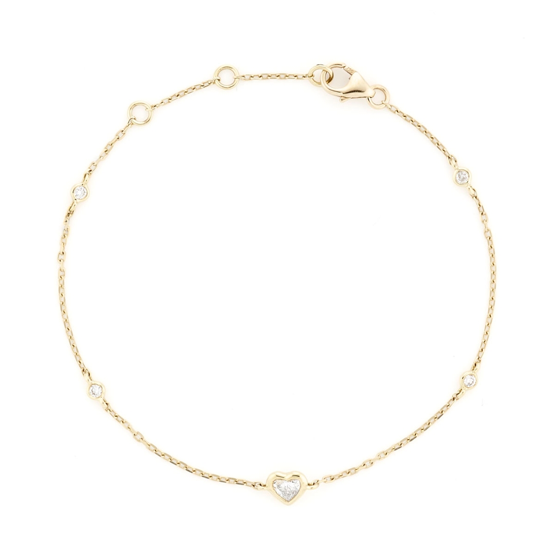 A brand new, unused, certified 18ct yellow gold natural diamond chain bracelet, set with one heart-cut diamond & four brilliant-cut diamonds.