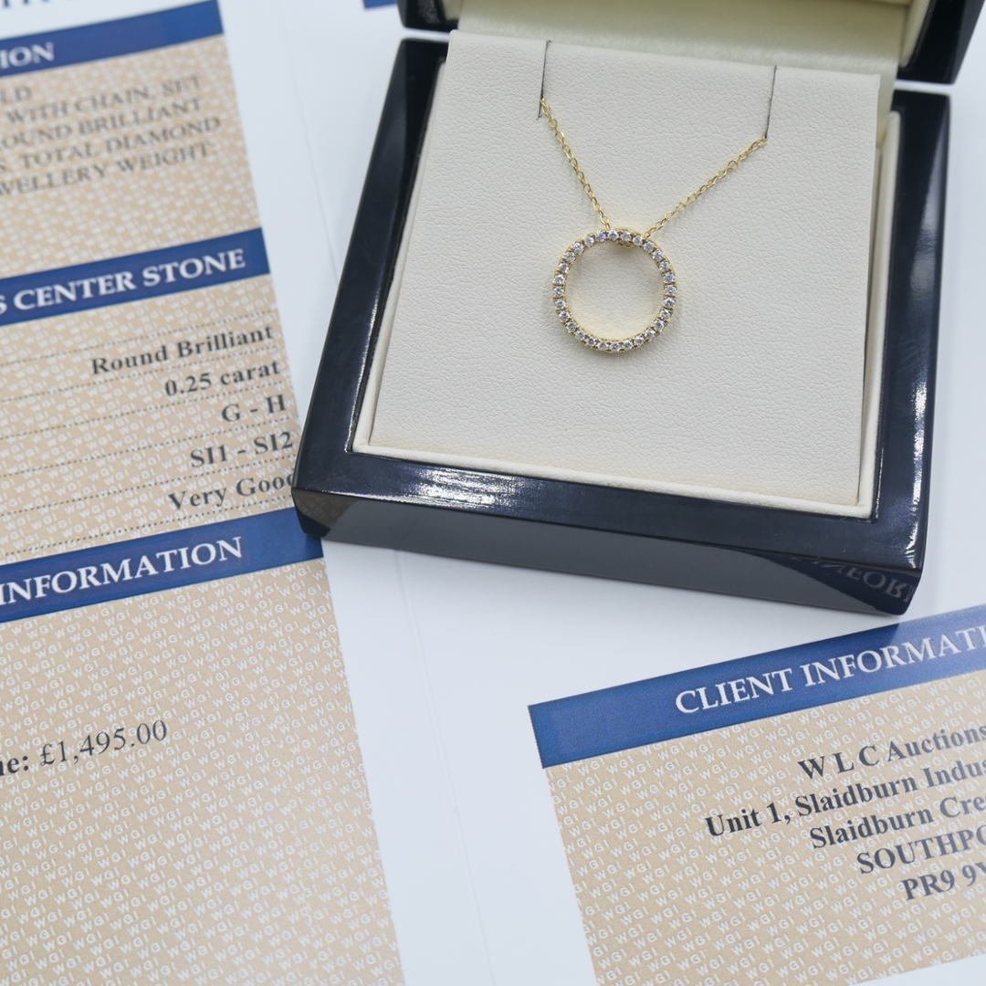 A brand-new, unused 18ct yellow gold pendant that embodies effortless elegance and timeless simplicity. This stunning circle-shaped cluster pendant is adorned with a delicate array of round brilliant-cut natural diamonds, totalling 0.25 carats. Each diamond, graded G–H in colour and SI1–SI2 in clarity, has been meticulously selected for its radiant sparkle and fine symmetry, creating a graceful halo of light. The warm tones of the yellow gold beautifully enhance the natural brilliance of the diamonds, producing a harmonious blend of luxury and refinement. The circular design represents eternity, unity, and perfection — making it an ideal piece for everyday sophistication or a meaningful gift.