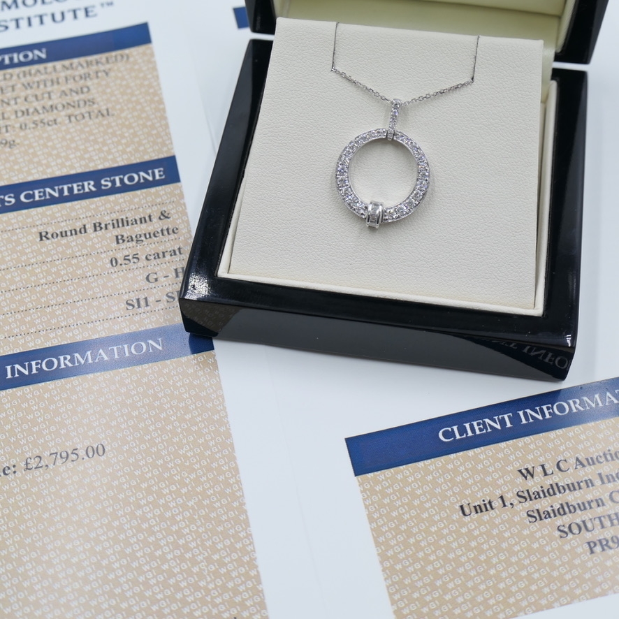 A brand-new, unused certified 18ct white gold natural diamond circle pendant, beautifully designed with a harmonious blend of baguette-cut and round brilliant-cut diamonds totalling 0.55 carats. The circular form's symmetry, paired with the precise geometric arrangement of baguette stones and the sparkle of brilliant cuts, gives this piece an exceptional balance of structure and radiance. Each diamond, graded G–H in colour and SI1–SI2 in clarity, captures and reflects light with remarkable brilliance, ensuring it glows with timeless sophistication. The cool tone of white gold enhances the diamonds’ natural fire, creating an elegant, versatile pendant suitable for any occasion.