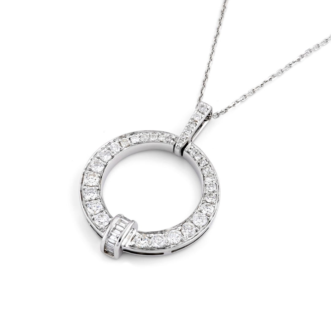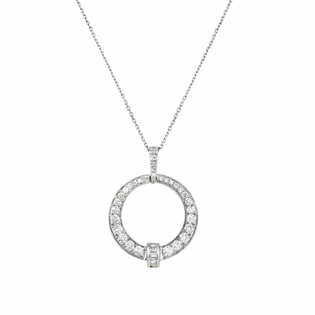 A brand-new, unused, certified natural diamond circle-shaped cluster pendant, with a cluster of baguette-cut & brilliant cut diamonds, set in 18ct white gold.