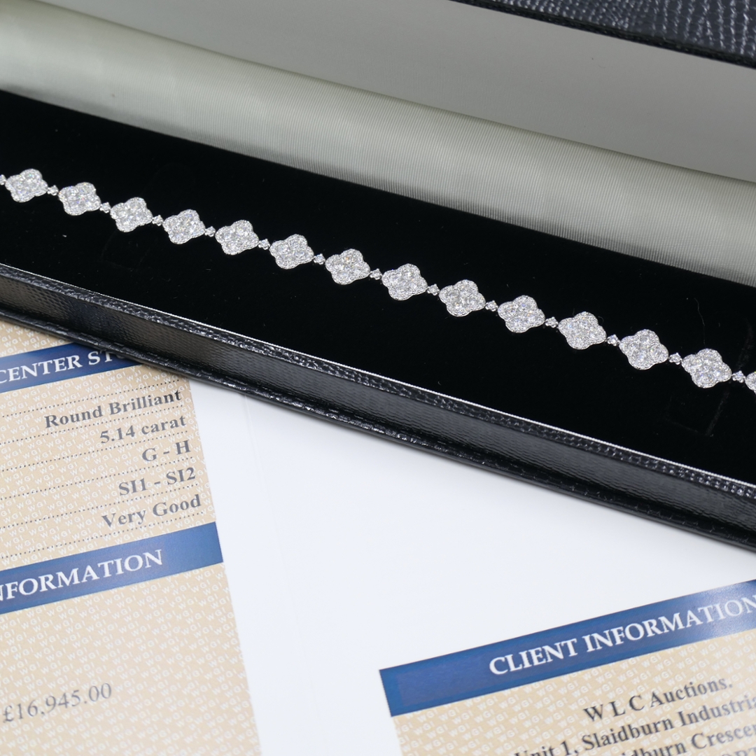 A brand-new, unused 18ct white gold diamond bracelet that radiates elegance and refined sophistication. This exquisite piece is beautifully designed with a series of clover-shaped clusters, each intricately set with round brilliant-cut natural diamonds. Totalling an impressive 5.14 carats, the diamonds are graded G–H in colour and SI1–SI2 in clarity, offering a dazzling play of light and depth from every angle. The flowing arrangement of the clover motifs adds graceful symmetry, giving the bracelet a luxurious, timeless appeal that sits perfectly on the wrist.