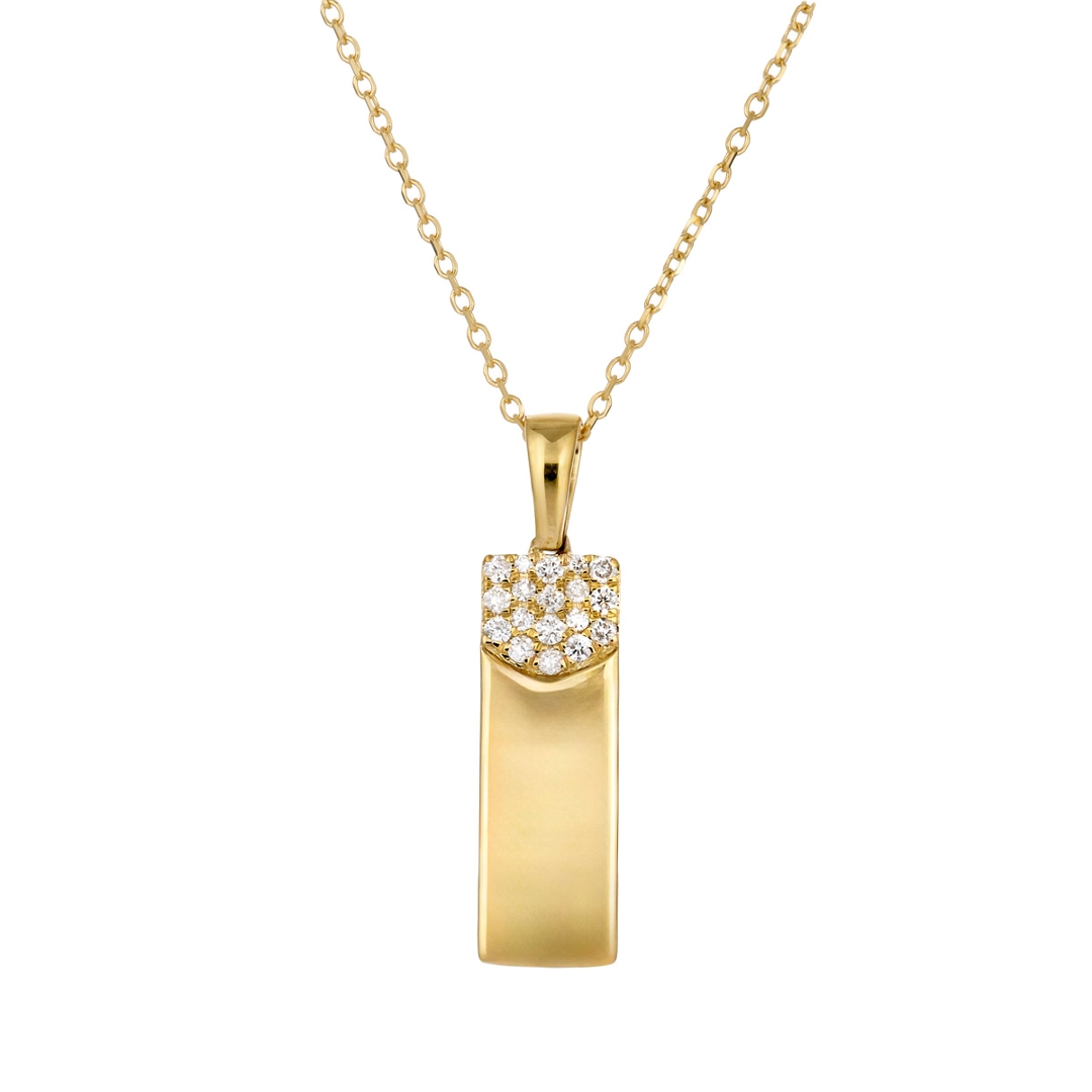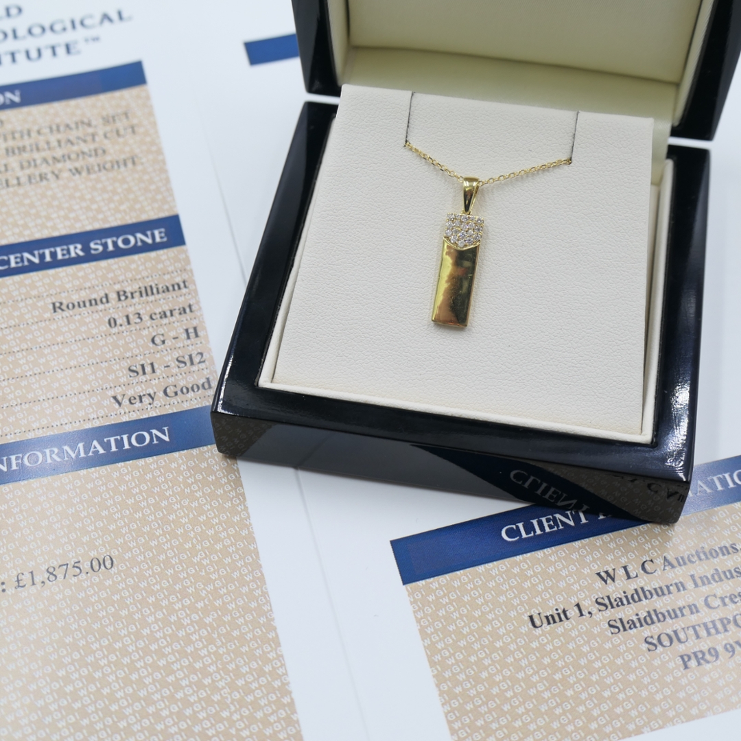 A brand-new, unused, certified 18ct yellow gold natural diamond cluster pendant, crafted with precision and elegance. The pendant features a refined rectangular design adorned with a cluster of round brilliant-cut natural diamonds totalling 0.13 carats. Each diamond is G–H in colour and SI1–SI2 in clarity, offering a soft, radiant sparkle that complements the rich warmth of yellow gold. The clean lines and subtle diamond detailing create a harmonious balance of sophistication and modern charm, making this pendant perfect for both daily wear and refined evening style.