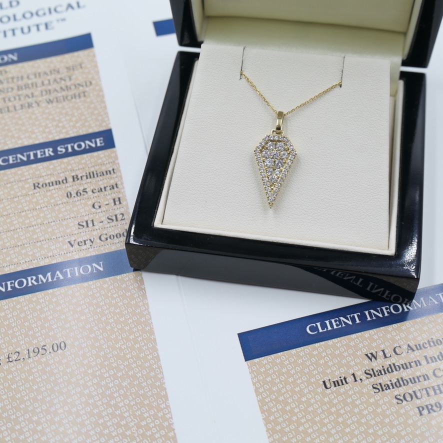 Valued at £2,195 and weighing 3.30 grams, this pendant offers an exquisite blend of craftsmanship and investment potential. Its dazzling arrangement of diamonds and classic gold setting ensures it will remain a treasured piece of fine jewellery, admired and appreciated for generations to come.