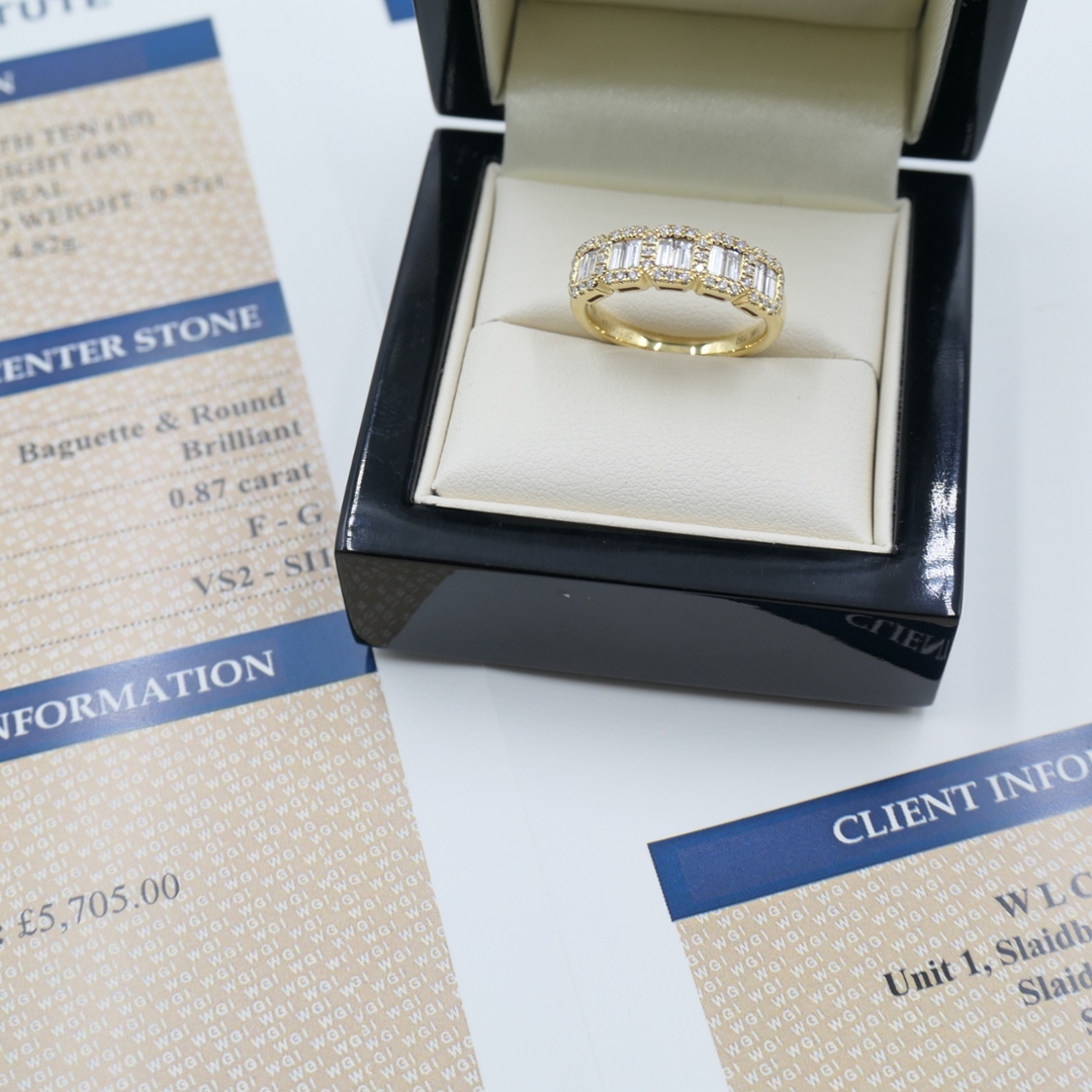 Natural diamonds are celebrated for their remarkable rarity, purity, and lasting brilliance, symbolising both beauty and stability. Their enduring value and intrinsic worth make them one of the most trusted and desirable investments in fine jewellery, cherished for generations. With a total weight of 4.82 grams and an insurance valuation of £5,705.00, this certified ring exemplifies exceptional craftsmanship and timeless appeal. A truly elegant creation, it brings together the sophistication of baguette-cut precision, the radiance of brilliant-cut sparkle, and the enduring prestige of natural diamonds—an exquisite statement piece that perfectly balances glamour, craftsmanship, and lasting value.