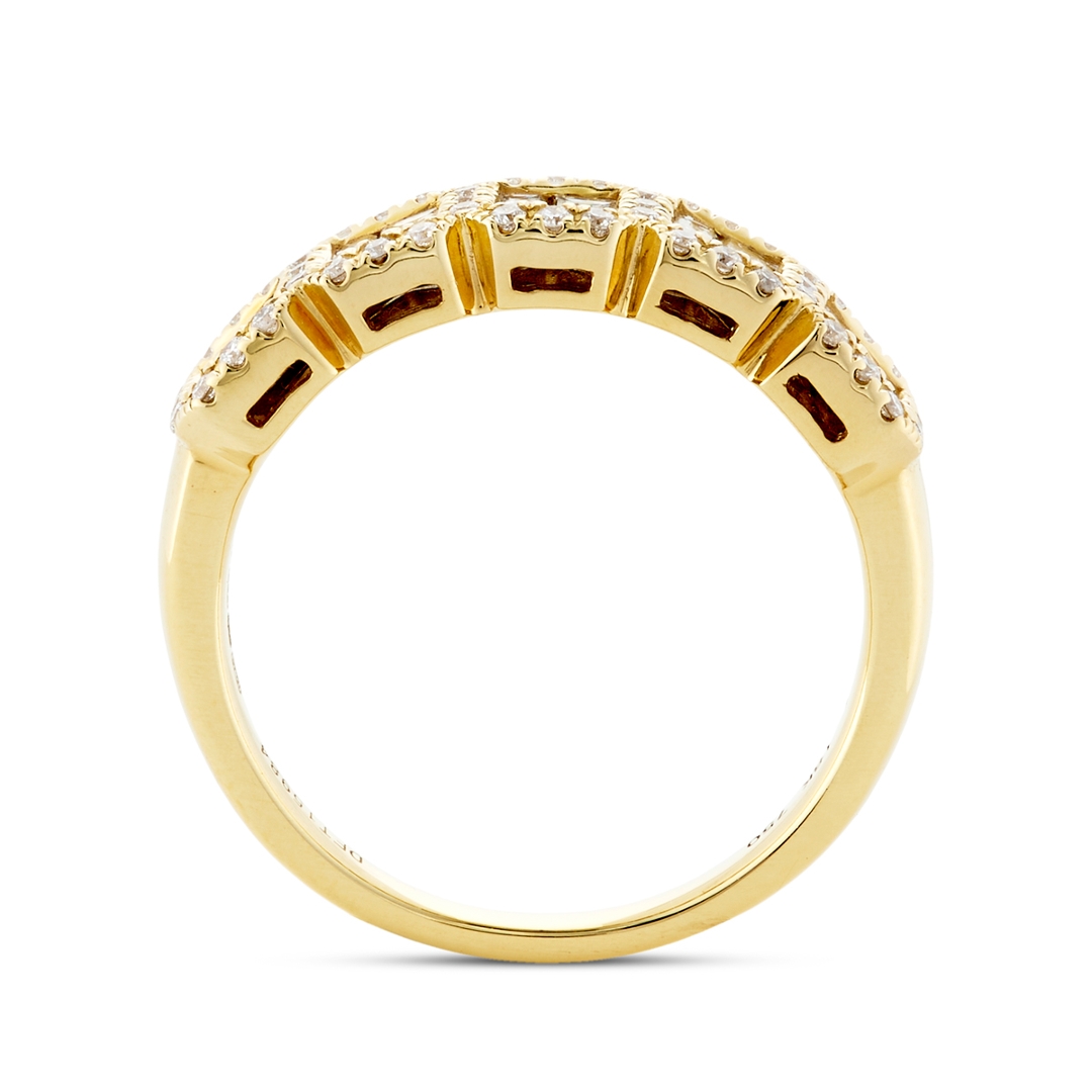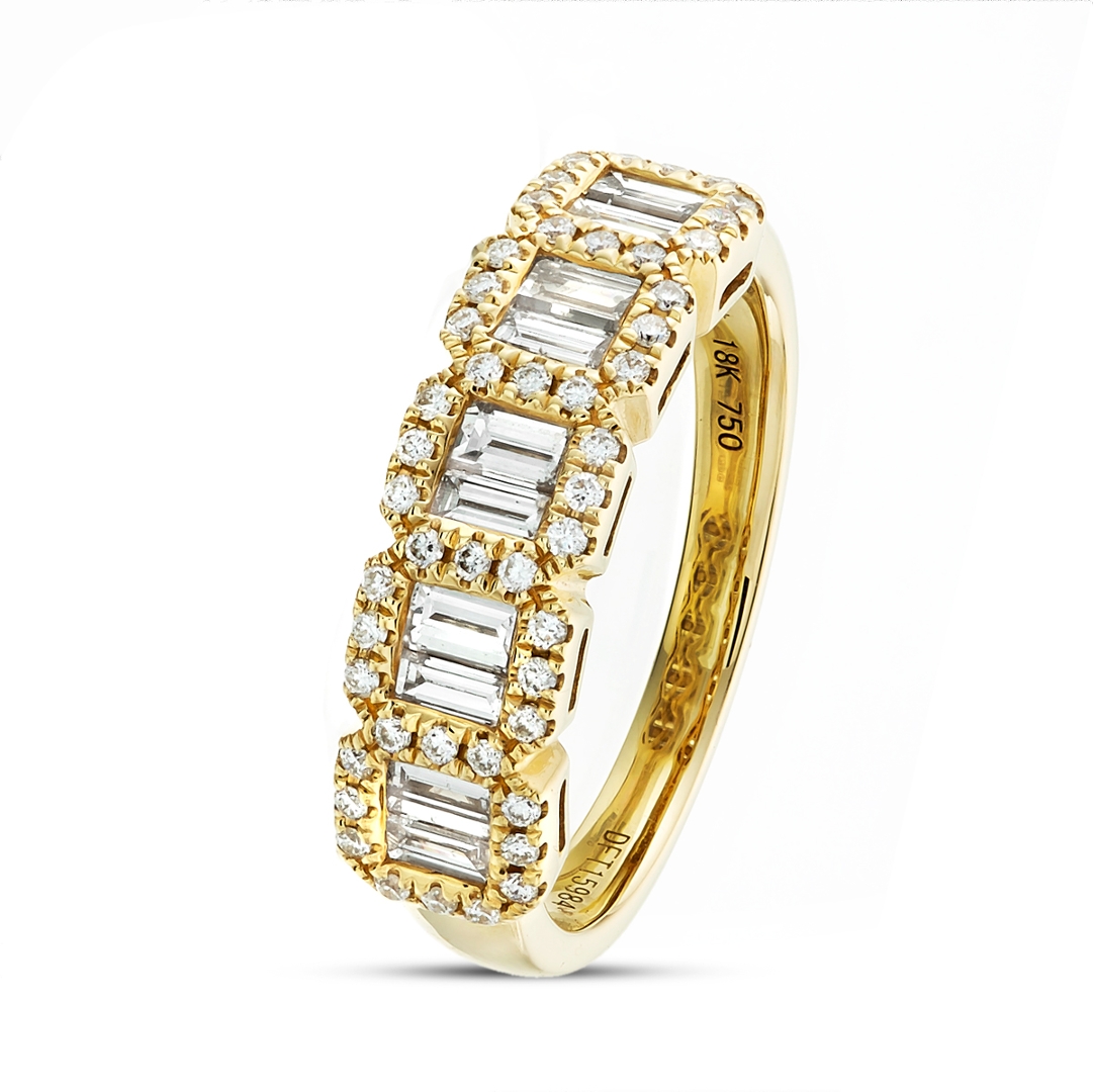A brand-new, unused certified natural diamond cluster ring, exquisitely crafted in 18ct yellow gold. This stunning piece features a captivating arrangement of baguette-cut natural diamonds at the centre, surrounded by a dazzling halo of brilliant-cut diamonds that enhances its radiance and depth. Together, the diamonds total 0.87 carats, with exceptional F-G colour and VS2–SI1 clarity, producing a mesmerising display of sparkle and sophistication. The warm tone of the yellow gold setting complements the diamonds’ crisp brilliance perfectly, creating a timeless design that combines luxury, refinement, and enduring elegance.