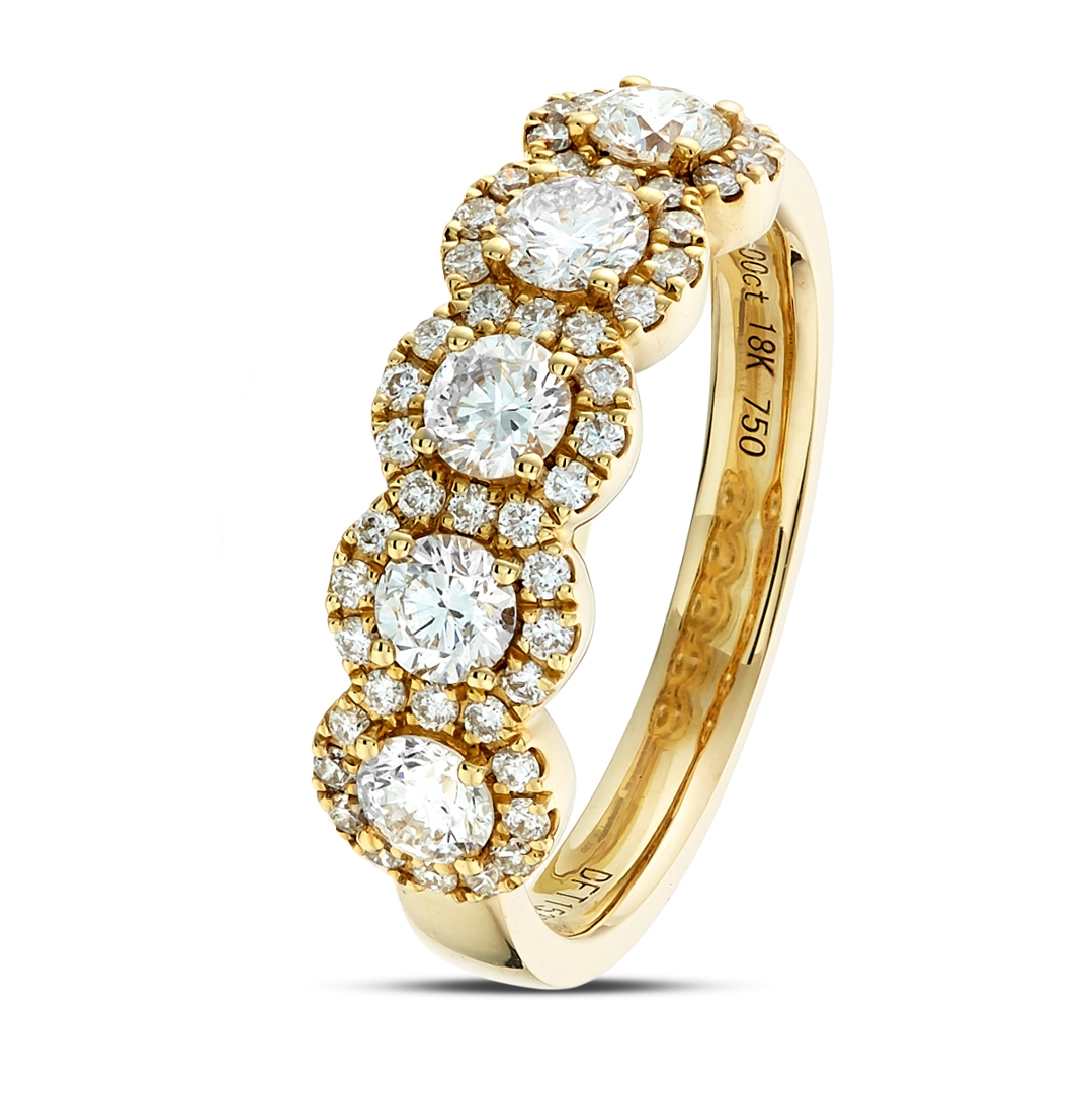 A brand-new, unused, certified natural diamond cluster ring, with five brilliant-cut diamonds to the centre & a cluster of brilliant-cut diamonds in a halo setting, set in 18ct yellow gold.