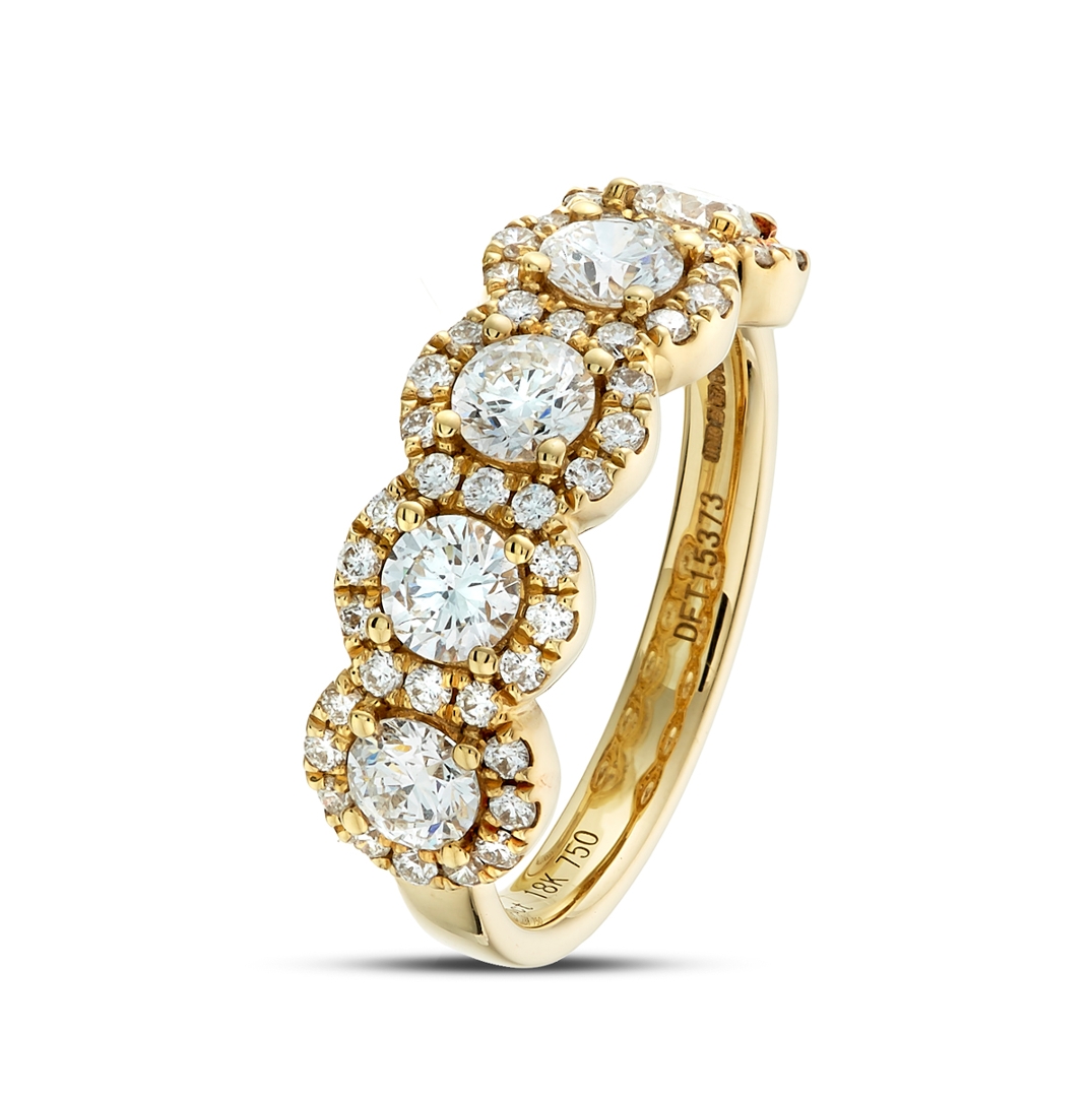 A brand-new, unused, certified natural diamond cluster ring, with five brilliant-cut diamonds to the centre & a cluster of brilliant-cut diamonds in a halo setting, set in 18ct yellow gold.