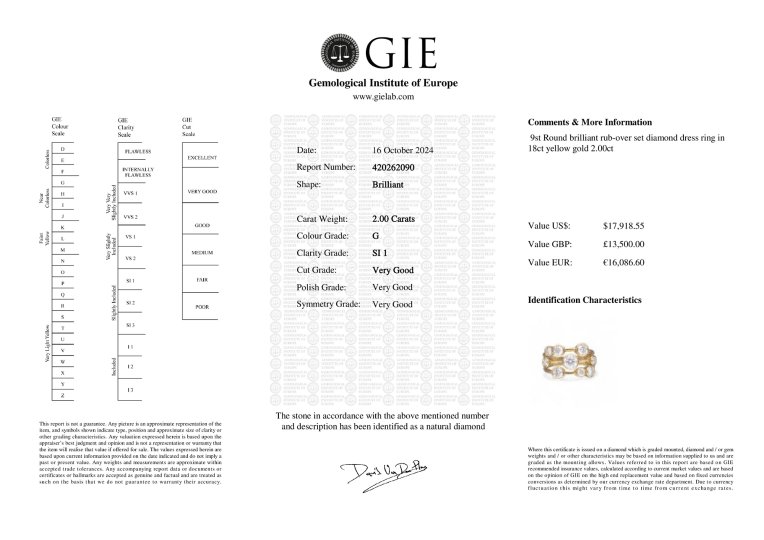 A brand-new, unused certified 18ct yellow gold natural diamond cluster ring, this piece showcases the timeless allure of brilliant-cut diamonds, elegantly arranged to create an eye-catching cluster. With a total diamond weight of 2.00 carats, each diamond is graded SI1 for clarity and G for colour, ensuring excellent sparkle and brilliance.