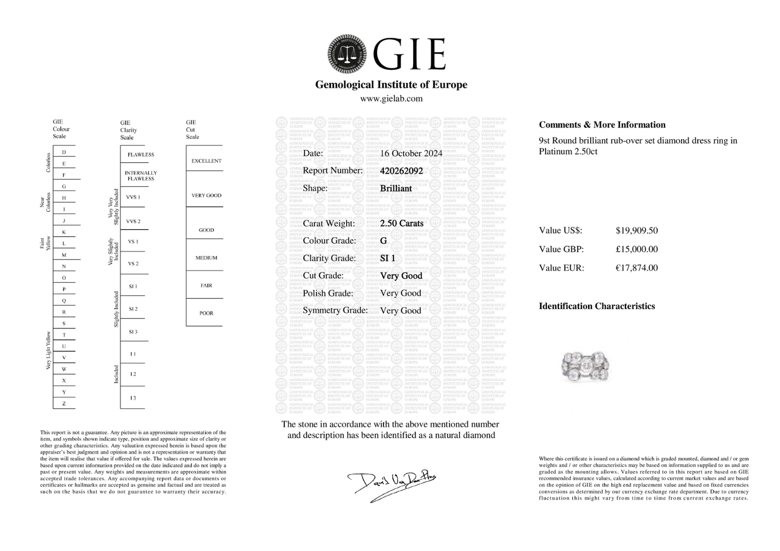 A brand new, unused certified platinum natural diamond cluster ring, featuring a stunning arrangement of brilliant cut diamonds that total 2.50 carats. The diamonds, graded SI1 for clarity and G for colour, are set in a meticulously crafted platinum band that enhances their brilliance. The cluster design maximises the sparkle of each diamond, creating a dazzling and sophisticated look.