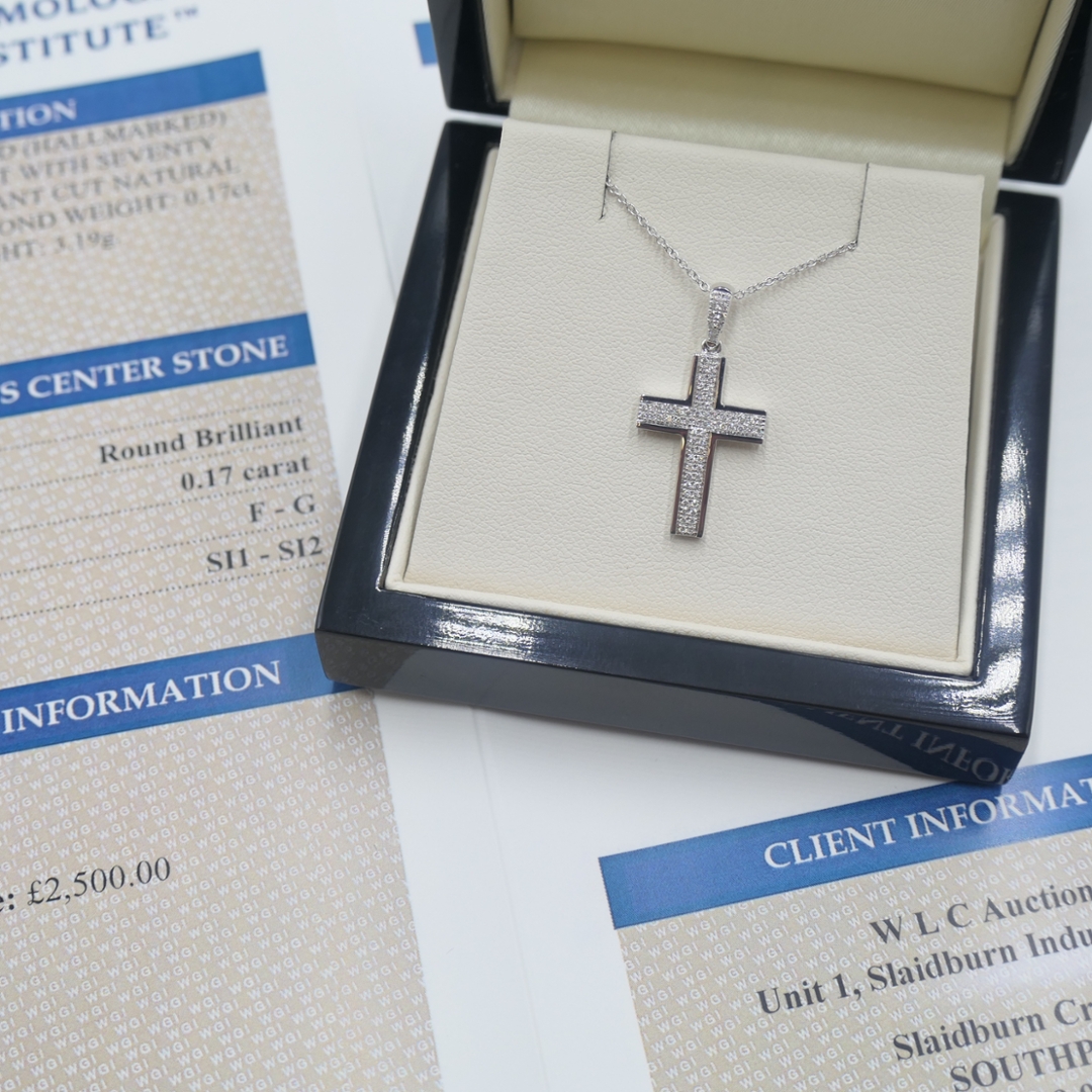 A brand-new, unused certified natural diamond cross pendant that beautifully combines faith, elegance and timeless craftsmanship. This refined piece is adorned with a cluster of brilliant-cut natural diamonds, totalling 0.17ct, carefully arranged to create a radiant display of light. The diamonds, graded F–G in colour and SI1–SI2 in clarity, offer exceptional sparkle and purity, enhancing the pendant’s graceful design. Expertly crafted in luxurious 18ct white gold, the pendant’s sleek finish highlights the brilliance of each diamond, adding a sophisticated contemporary touch. With a total weight of 3.19 grams and a professional valuation of £2,500, it embodies understated luxury and enduring beauty.
