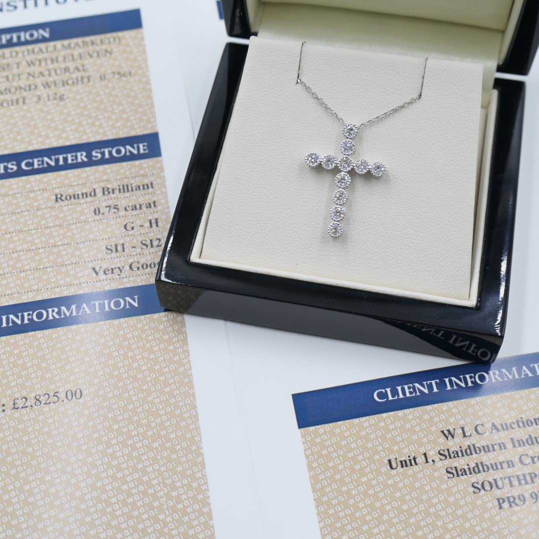 A brand-new, unused, certified 18ct white gold natural diamond cross pendant, elegantly crafted and set with eleven brilliant-cut natural diamonds totalling 0.75 carats. Each diamond displays superb brilliance, with G–H colour and SI1–SI2 clarity ensuring a near-colourless sparkle and refined radiance. The clean symmetry of the cross design reflects a perfect balance between faith and fine jewellery, making it both meaningful and timeless. This pendant embodies understated luxury, with a graceful presence that complements any style or occasion.