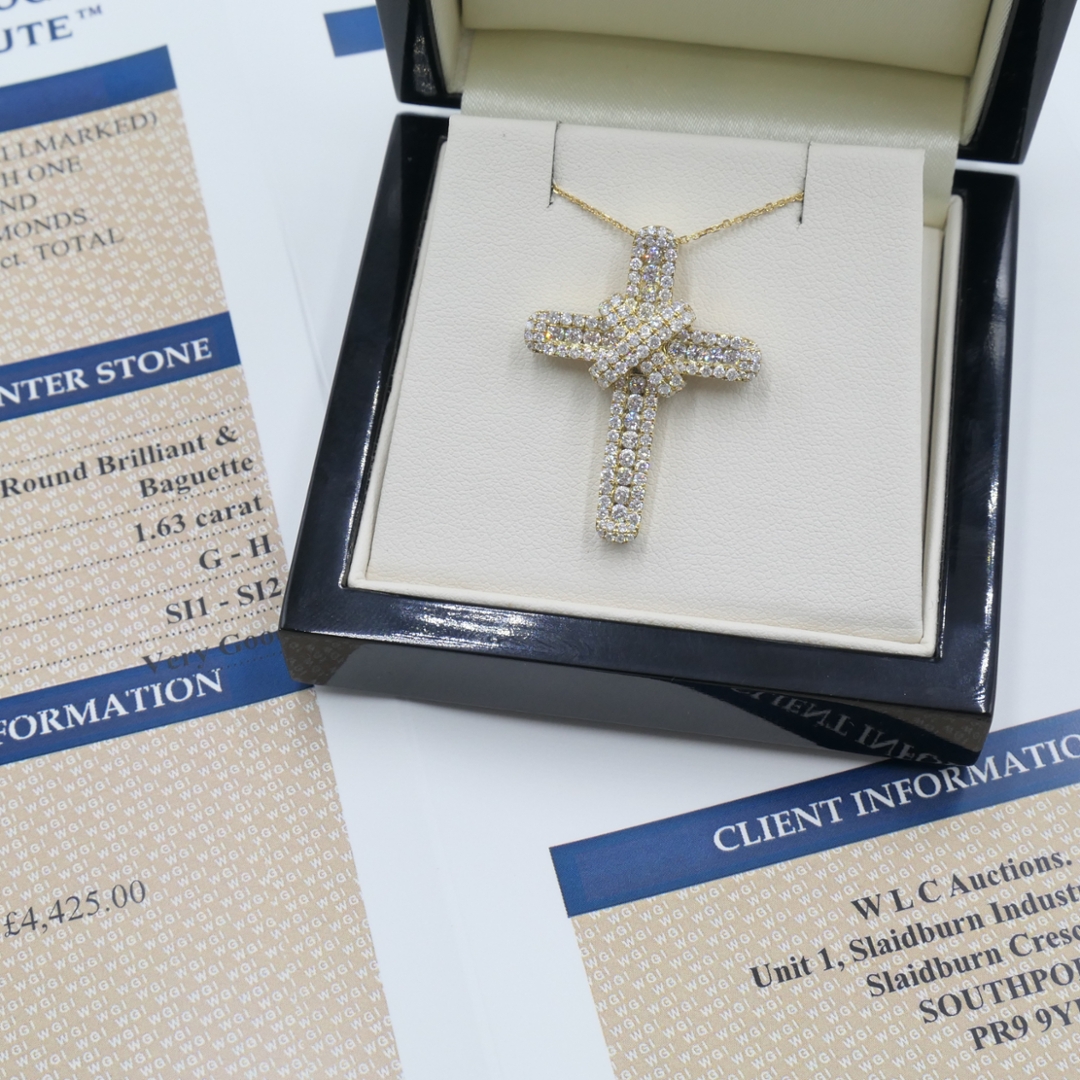 A brand-new, unused, certified natural diamond cross pendant, this stunning piece combines timeless symbolism with exceptional craftsmanship. Beautifully designed in 9ct yellow gold, it features a captivating cluster of baguette-cut and brilliant-cut natural diamonds, together weighing an impressive 1.63 carats. Each diamond, graded G–H in colour and SI1–SI2 in clarity, radiates extraordinary fire and brilliance. The baguette cuts lend refined structure and sophistication, while the brilliant cuts add vibrant sparkle, creating a mesmerising contrast that brings the cross design to life.