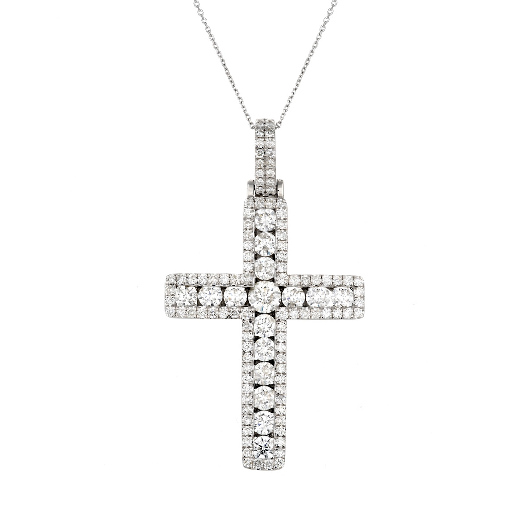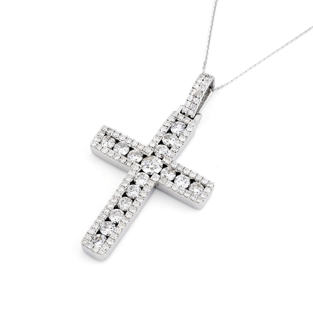A brand-new, unused, certified 9ct white gold natural diamond cross pendant, magnificently set with a cluster of round brilliant-cut diamonds totalling an impressive 4.94 carats. Each diamond exhibits exceptional brilliance and fire, graded G–H in colour and SI1–SI2 in clarity, creating a dazzling display of light and refinement. The cross design, a symbol of faith and strength, is elevated by the precision of its craftsmanship and the radiance of natural diamonds, creating an aura of elegance and sophistication. The lustrous white gold setting enhances the brilliance of each stone, producing a piece that commands attention while maintaining timeless grace.