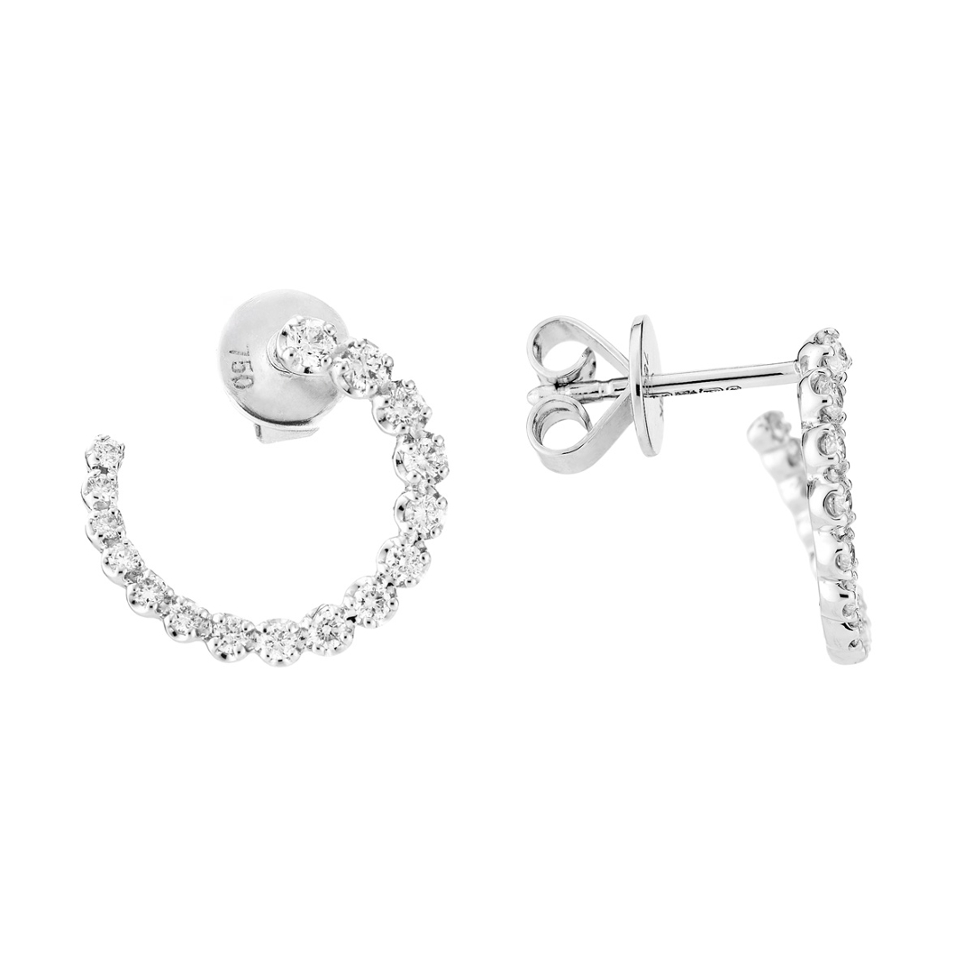 A brand-new, unused certified pair of natural diamond curl-shaped cluster earrings that exude effortless sophistication and radiant sparkle. Crafted in 18ct white gold, these beautifully curved earrings are set with a total of 0.41 carats of brilliant-cut natural diamonds, perfectly arranged to follow the design's elegant contours. Each diamond, graded F–G in colour and SI1–SI2 in clarity, captures light from every angle, producing a captivating brilliance that enhances its refined setting. The graceful curl silhouette offers a contemporary twist on a timeless classic, balancing fluidity and precision for a look that is both modern and enduring.