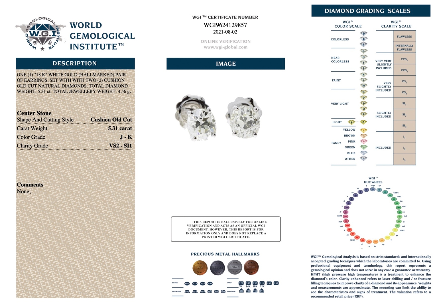 A brand-new, unused, certified pair of natural diamond solitaire earrings, showcasing two cushion old-cut diamonds that reflect a distinctive period character rarely seen in modern jewellery. With a combined diamond weight of 5.31 carats, these old-cut stones feature broad facets and a softer, romantic brilliance that strongly appeals to collectors who value authenticity and historical cutting styles.