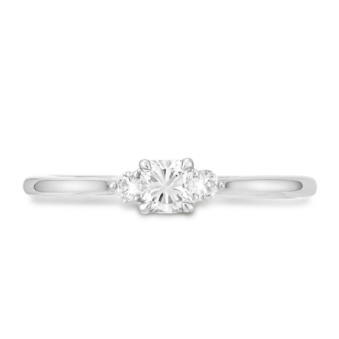 A brand new, unused, certified natural diamond solitaire engagement ring, with one cushion-cut diamond to the centre & two brilliant-cut diamonds to the sides, set in platinum.