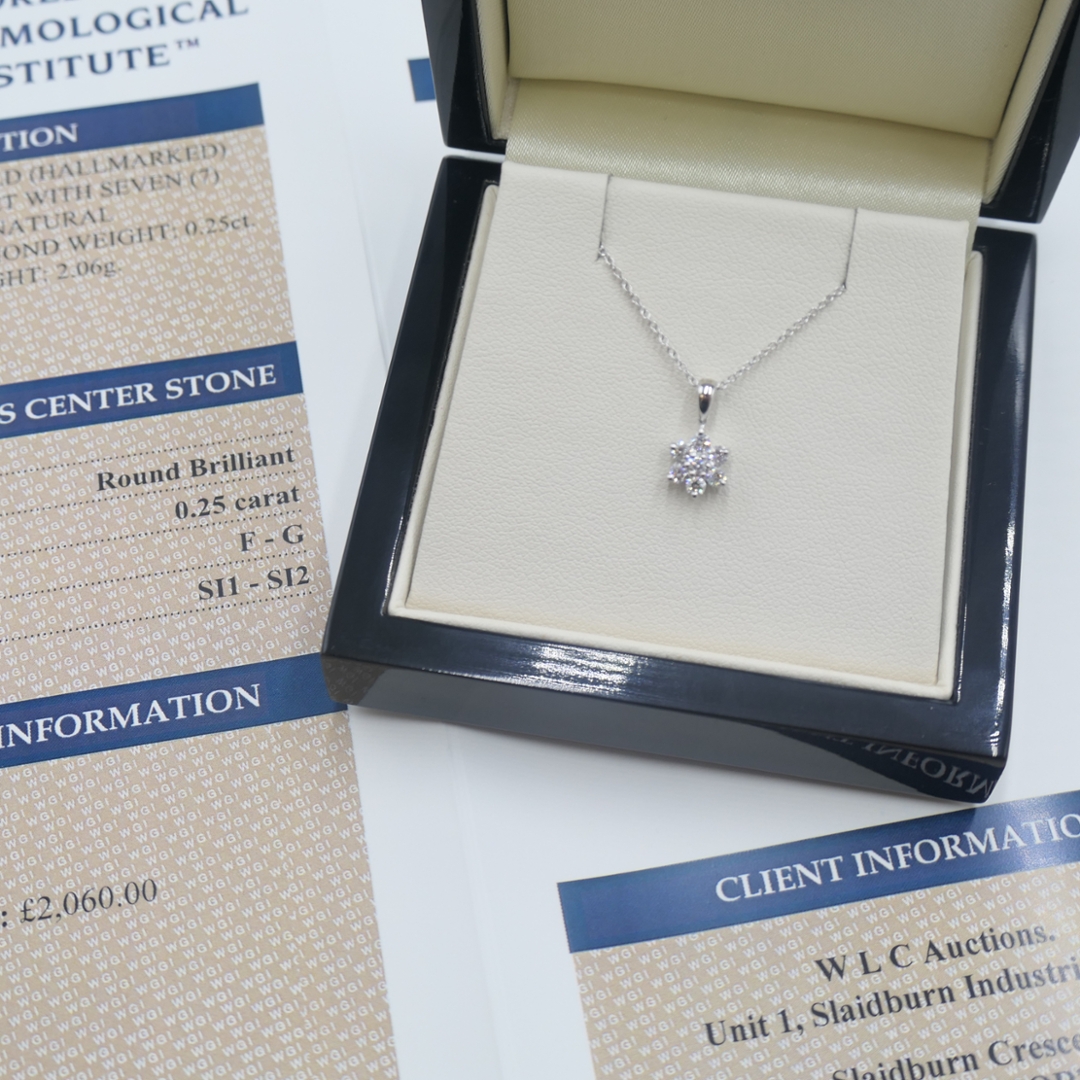 A brand-new, unused, certified natural diamond daisy-shaped cluster pendant that radiates charm, elegance and timeless sophistication. This beautifully designed piece is set with seven brilliant-cut natural diamonds, totalling 0.25ct, arranged in a delicate floral pattern that captures light from every angle. The diamonds, graded F–G in colour and SI1–SI2 in clarity, exhibit bright, lively sparkle and excellent balance, creating a graceful display of brilliance. Expertly crafted in 18ct white gold, the pendant’s sleek, lustrous finish enhances the diamonds’ natural luminosity and offers a refined, modern appeal. With a total weight of 2.06 grams and a professional valuation of £2,060, this piece perfectly combines delicate artistry with enduring luxury.