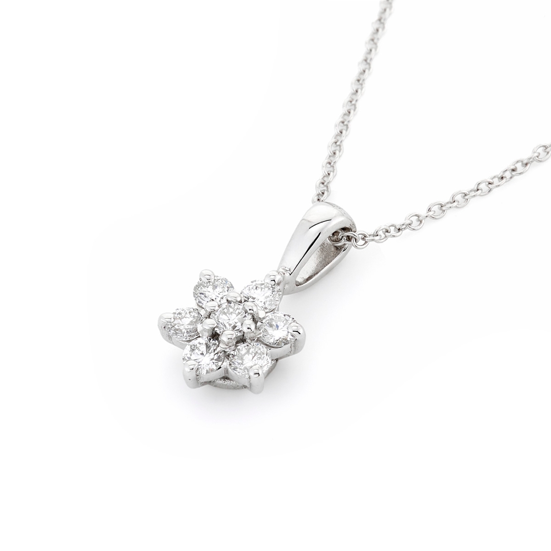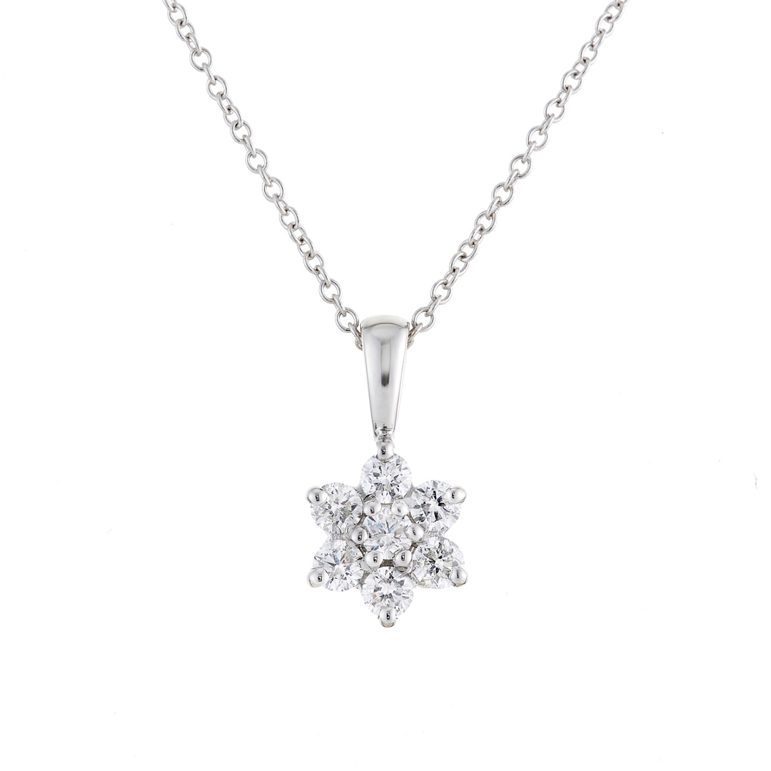 A brand-new, unused, certified natural diamond daisy-shaped cluster pendant, set with seven brilliant-cut diamonds, set in 18ct white gold.