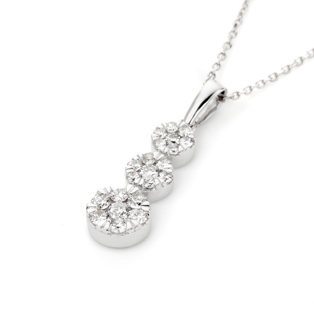 A brand-new, unused certified 18ct white gold natural diamond droplet pendant, elegantly designed with three graduated clusters of round brilliant-cut diamonds totalling 0.50 carats. Each diamond displays exceptional fire and brilliance, enhanced beautifully by the cool gleam of white gold. The pendant’s cascading design offers graceful movement and timeless sophistication, making it a versatile piece suited for both refined everyday wear and special occasions. With an F–G colour grade and SI1–SI2 clarity, these near-colourless diamonds radiate with impressive sparkle and light performance.