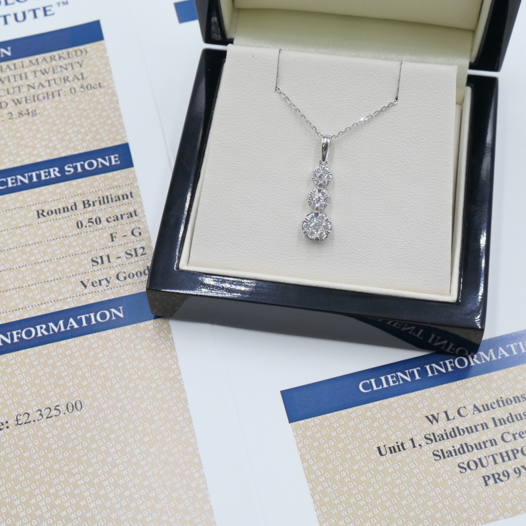 A brand-new, unused certified 18ct white gold natural diamond droplet pendant, elegantly designed with three graduated clusters of round brilliant-cut diamonds totalling 0.50 carats. Each diamond displays exceptional fire and brilliance, enhanced beautifully by the cool gleam of white gold. The pendant’s cascading design offers graceful movement and timeless sophistication, making it a versatile piece suited for both refined everyday wear and special occasions. With an F–G colour grade and SI1–SI2 clarity, these near-colourless diamonds radiate with impressive sparkle and light performance. With a weight of 2.84 grams.