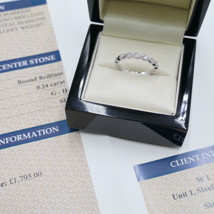 A brand-new, unused certified natural diamond eternity ring that embodies everlasting elegance and refined craftsmanship. Beautifully set with a continuous cluster of brilliant-cut natural diamonds totalling 0.24 carats, this exquisite ring captures the light with effortless sparkle and brilliance. Graded G–H in colour and SI2 in clarity, the diamonds reflect the beauty and authenticity of natural stones, making this piece a true celebration of enduring love and purity. Each diamond has been meticulously set to ensure maximum radiance, creating a graceful and timeless display of fire and luminosity.