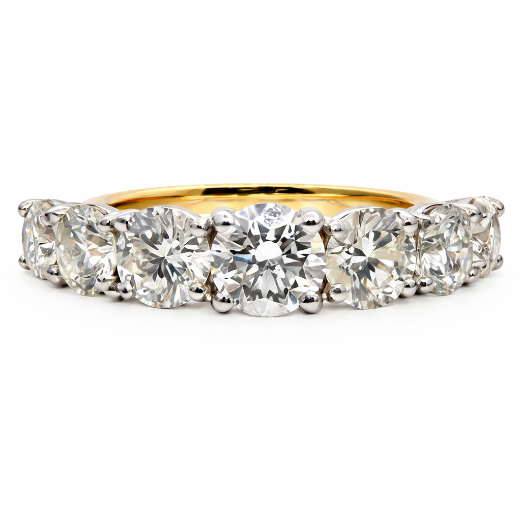 The diamonds are graded G-H colour and SI1-SI2 clarity, presenting a bright, lively appearance with excellent sparkle and strong visual impact. Each stone is carefully selected and proportioned to maximise brilliance, creating a continuous flow of light across the ring, while the setting enhances both the clarity and fire of the diamonds without distraction.