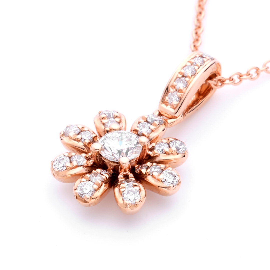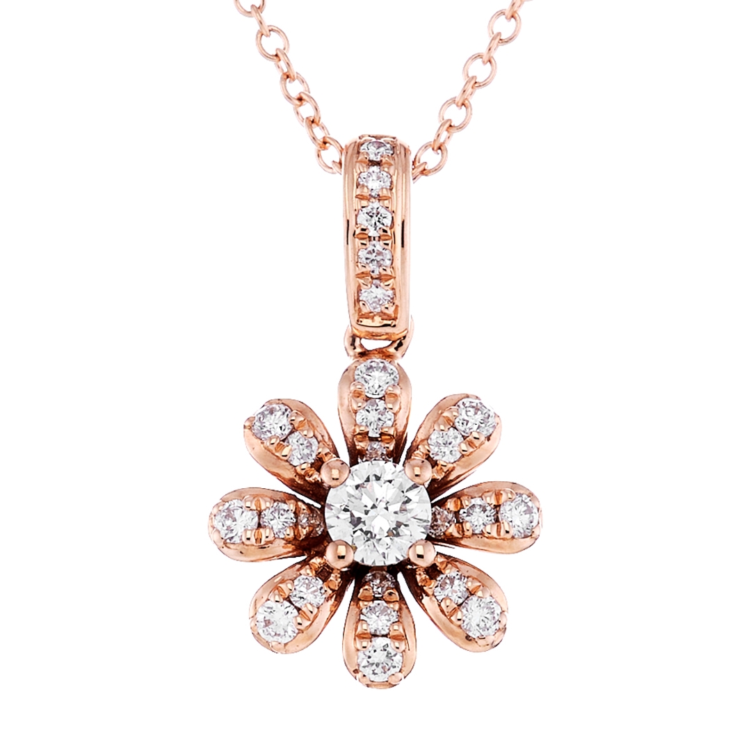 A brand new, unused, certified 18ct rose gold natural diamond flower-shaped pendant, set with brilliant cut diamonds in a flower design.
