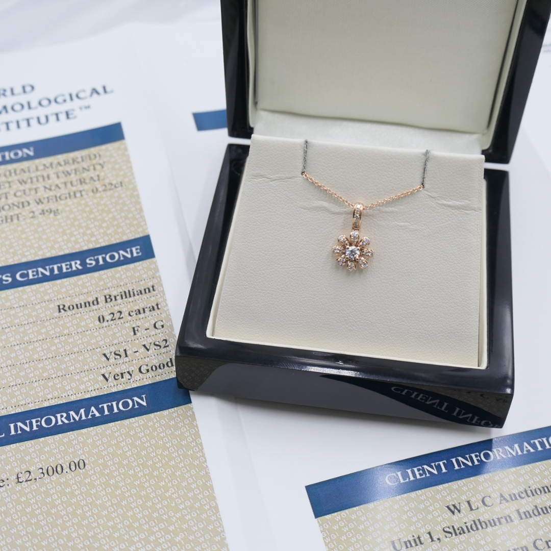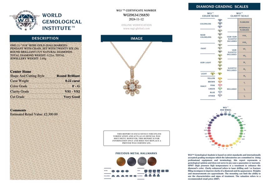 This stunning pendant is crafted in 18ct rose gold, which beautifully enhances the delicate flower design. It is adorned with 0.22ct of brilliant-cut natural diamonds, each expertly set to maximise their sparkle. The diamonds graded VS1-VS2 for clarity and F-G for colour, offer exceptional brilliance and fire, adding a luxurious touch to the piece. The flower shape symbolises beauty, growth, and new beginnings, making this pendant a meaningful and elegant accessory.