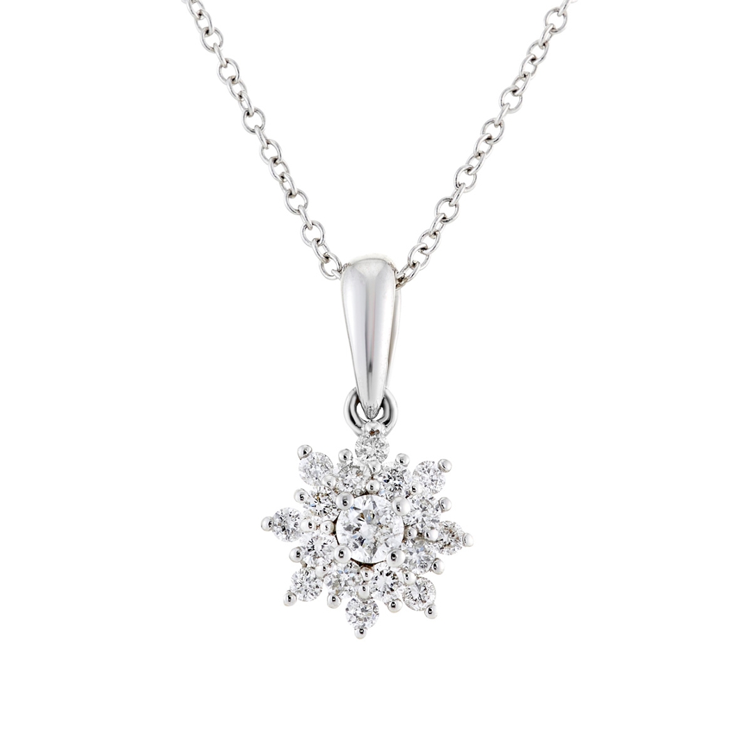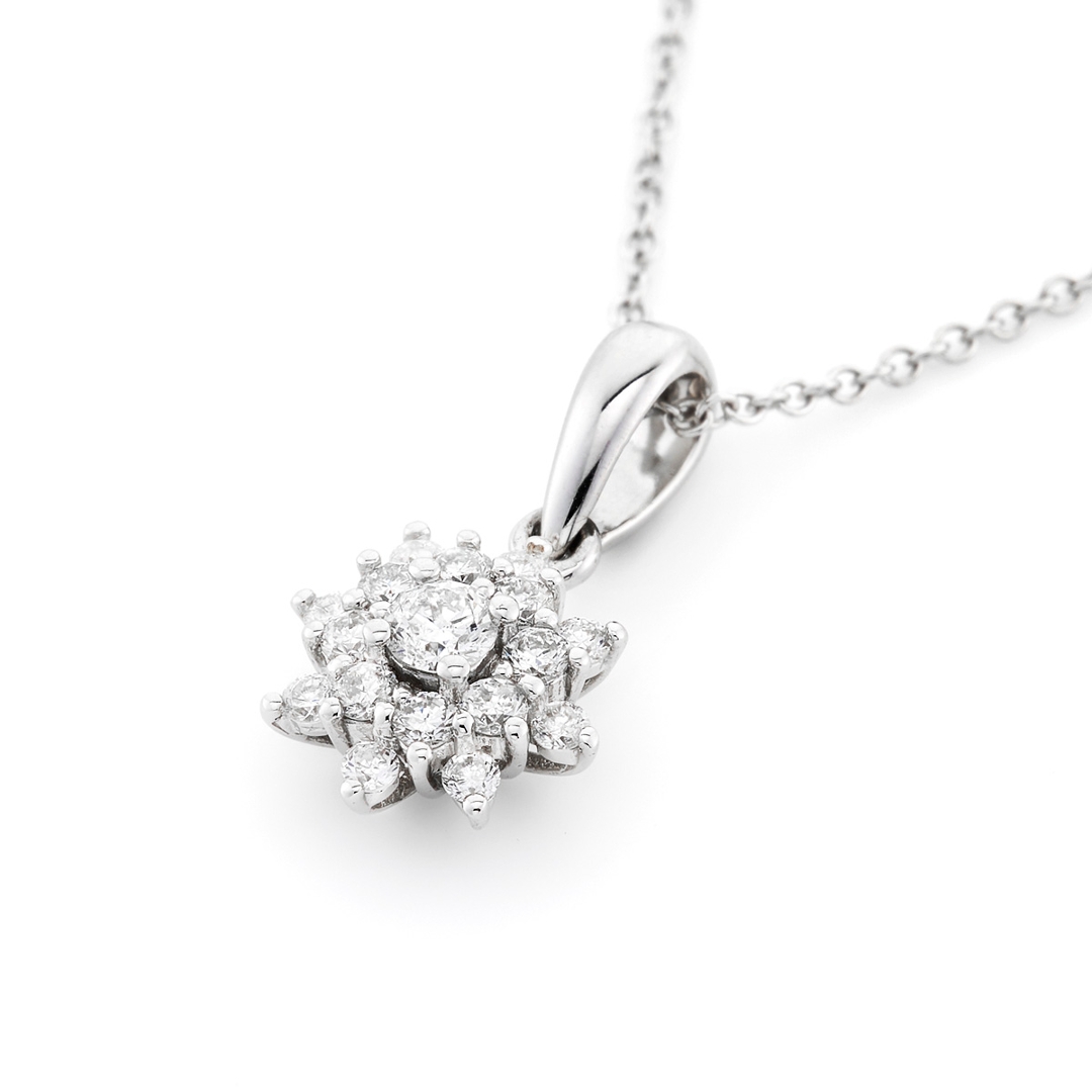 A brand new, unused, certified natural diamond flower-shaped cluster pendant, set with a cluster of brilliant cut diamonds, set in 18ct white gold.