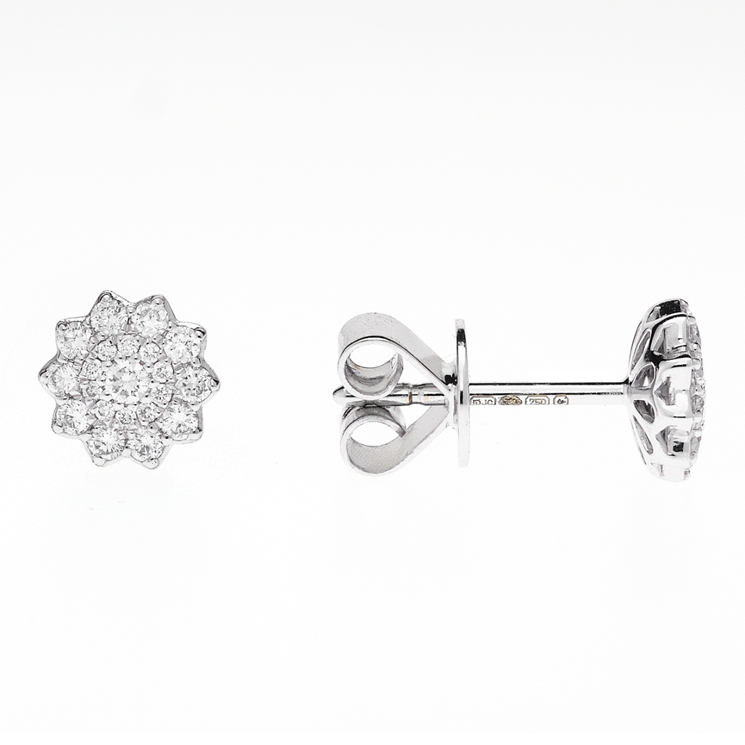 A brand new, unused, certified pair of natural diamond flower-shaped earrings, set with brilliant cut diamonds, set in 18ct white gold.