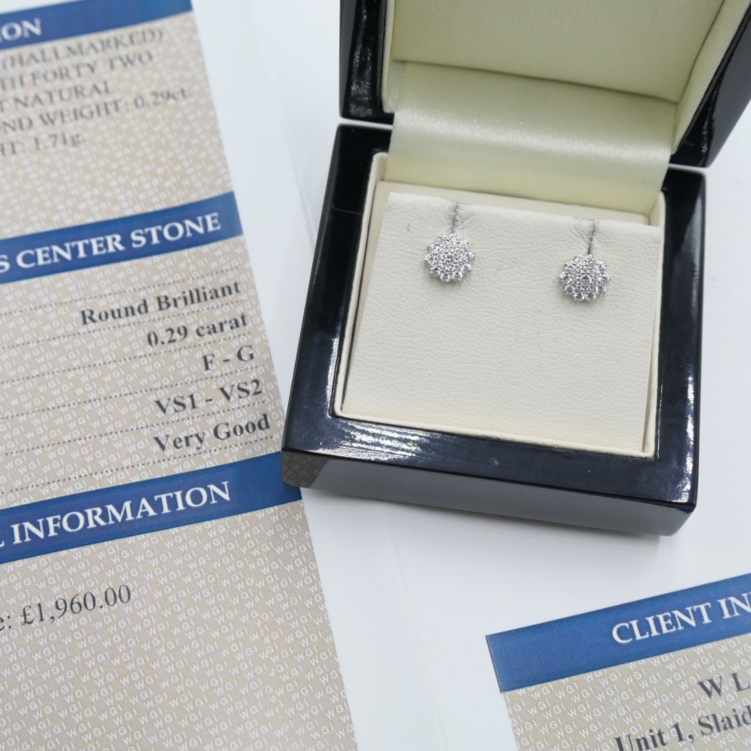 A brand-new, unused, certified pair of 18ct white gold, natural diamond, flower-shaped earrings, set with brilliant-cut diamonds, epitomise elegance and timeless beauty. These stunning earrings feature a total diamond weight of 0.29ct, with each brilliant-cut diamond meticulously selected for its clarity (VS1-VS2) and colour (F-G), ensuring exceptional sparkle and brilliance.