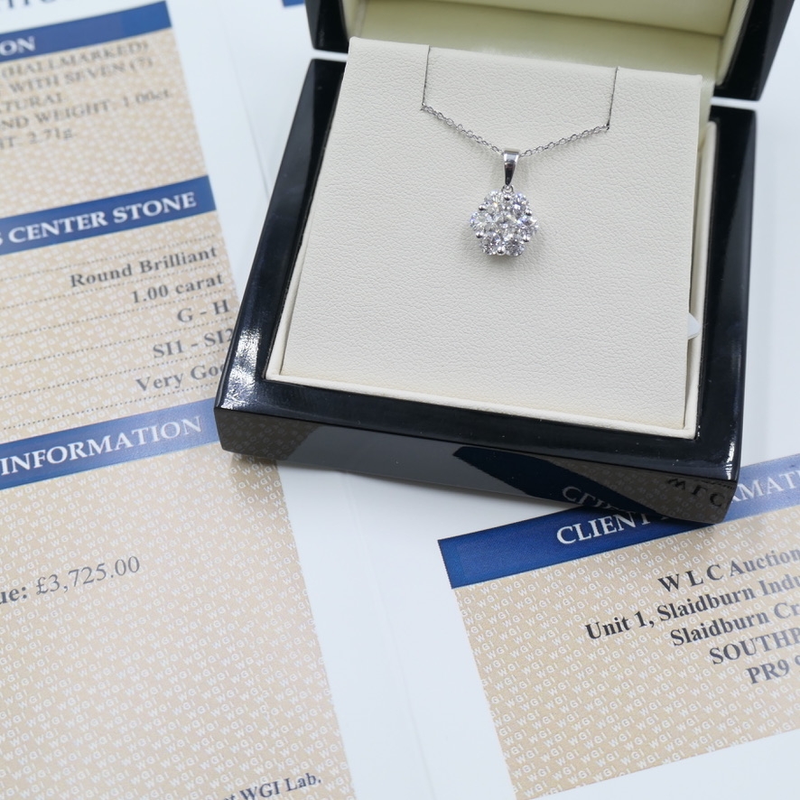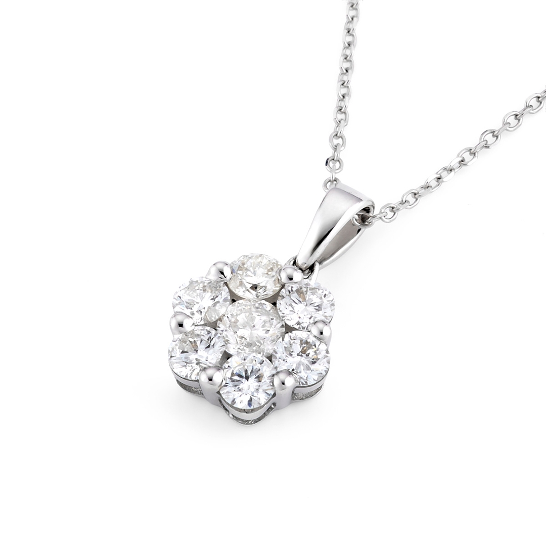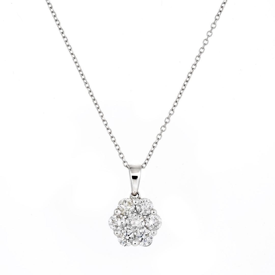 A brand-new, unused, certified 18ct white gold natural diamond flower-shaped pendant, exquisitely set with seven round brilliant-cut natural diamonds totalling 1.00 carat. The meticulously matched stones, graded G–H in colour and SI1–SI2 in clarity, form a radiant floral cluster that glimmers with refined elegance. The pendant’s harmonious symmetry and luminous sparkle reflect the superior craftsmanship that goes into its design, while the white gold setting enhances the natural brilliance of each diamond, creating a timeless, luxurious appearance.