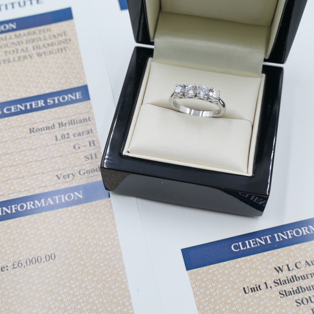 A brand-new, unused certified natural diamond four-stone eternity ring, beautifully crafted in platinum. This timeless design features four brilliant-cut natural diamonds, together weighing 1.02 carats, each carefully selected for their exceptional sparkle and symmetry. The diamonds, graded G-H in colour and SI1 in clarity, radiate a crisp, lively brilliance that reflects perfectly against the sleek, cool sheen of the platinum setting. Elegant and understated, the design allows the natural beauty and fire of each diamond to shine, symbolising enduring love and unity in a piece of exceptional craftsmanship.