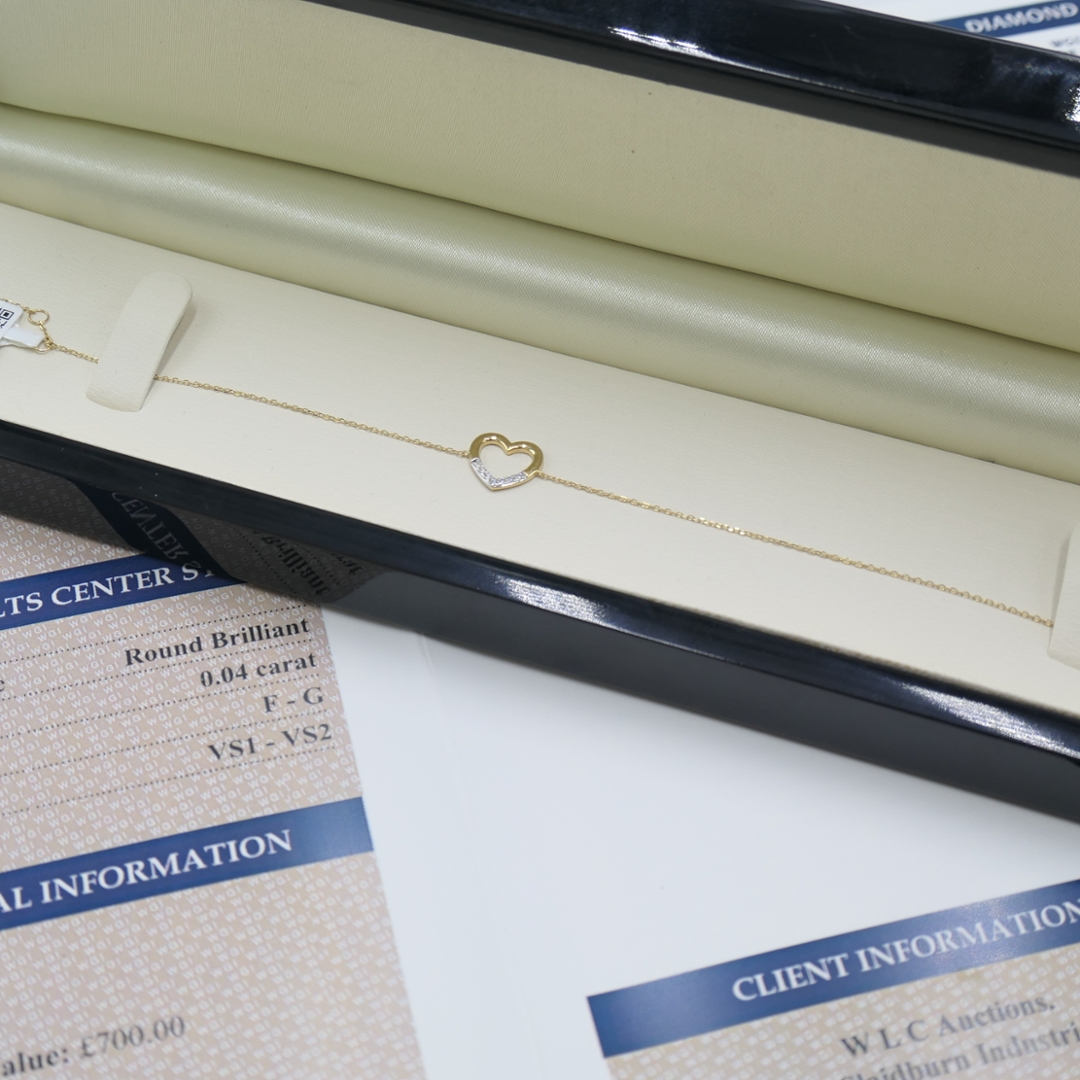A brand-new, unused, certified natural diamond heart-shaped chain bracelet that radiates delicate elegance and timeless charm. This beautifully crafted piece features a dainty heart motif set with a sparkling cluster of brilliant-cut natural diamonds, totalling 0.04ct. The diamonds, graded F–G in colour and VS1–VS2 in clarity, display remarkable brightness and purity, adding a subtle yet captivating sparkle to the design. Expertly crafted in 18ct yellow and white gold, the combination of warm and cool tones enhances the bracelet’s graceful aesthetic, offering a versatile and sophisticated finish. With a total weight of 0.92 grams and a professional valuation of £700, this bracelet represents fine craftsmanship and understated luxury.