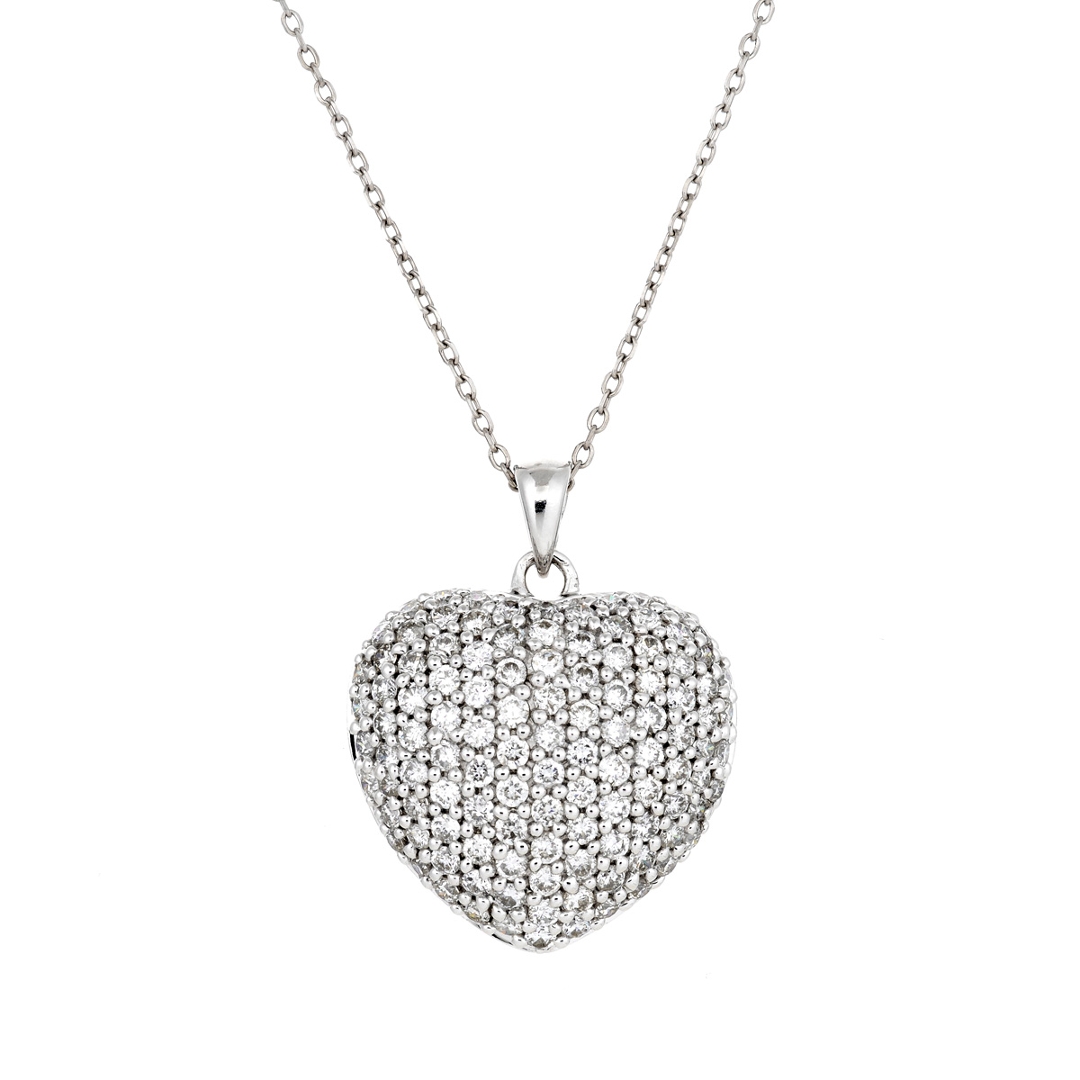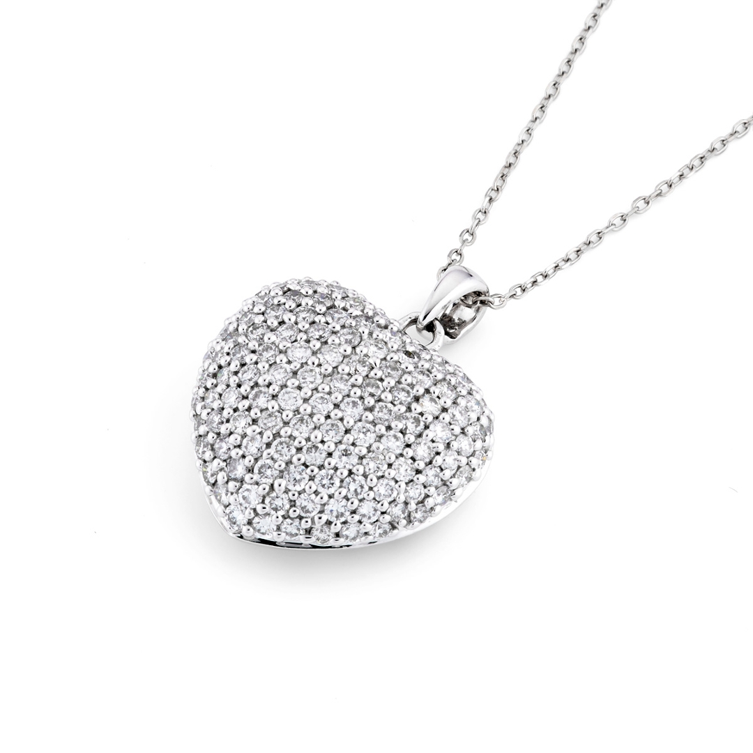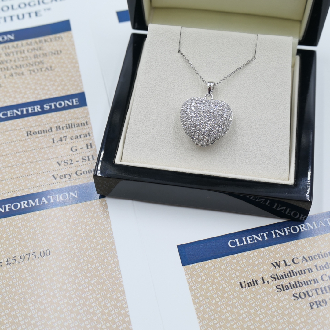 A brand-new, unused certified 18ct white gold natural diamond heart-shaped pendant, exquisitely set with a cluster of round brilliant-cut diamonds totalling 1.47 carats. The elegant curvature of the heart radiates with exceptional sparkle, while each diamond — graded G–H in colour and VS2–SI1 in clarity — enhances the pendant’s captivating brilliance. Weighing 6.09 grams. Crafted in lustrous white gold, the design strikes the perfect balance between romance and refinement, offering a luxurious expression of love and timeless beauty. Its sculpted silhouette and flawless symmetry make it an irresistible centrepiece that complements any attire, from daywear sophistication to evening glamour.