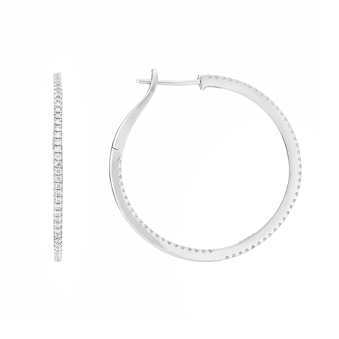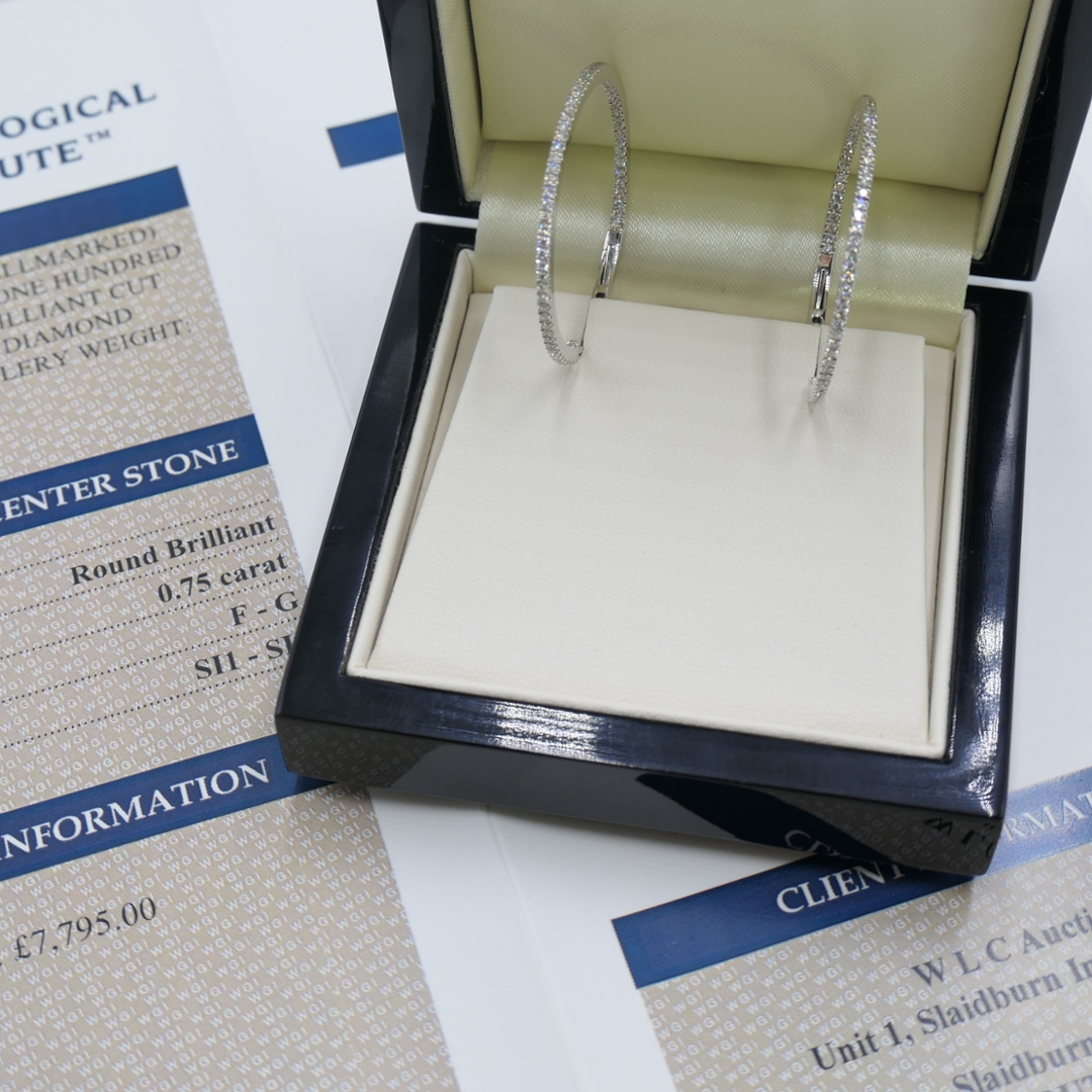 A brand-new, unused certified pair of natural diamond hooped earrings that exude sophistication and timeless beauty. Expertly crafted in luxurious 18ct white gold, these elegant hoops are set with a stunning cluster of brilliant-cut diamonds totalling 0.75 carats. Each diamond has been carefully chosen for its radiance and quality, graded F–G in colour and SI1–SI2 in clarity, resulting in a breathtaking display of sparkle that effortlessly catches the light from every angle. The design combines classic refinement with modern versatility, creating an exquisite pair suitable for both everyday elegance and evening glamour.