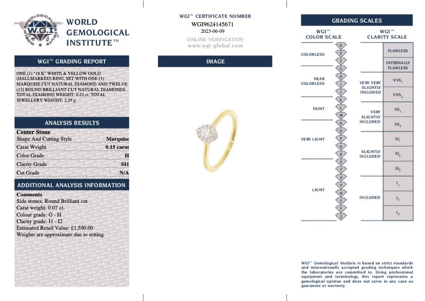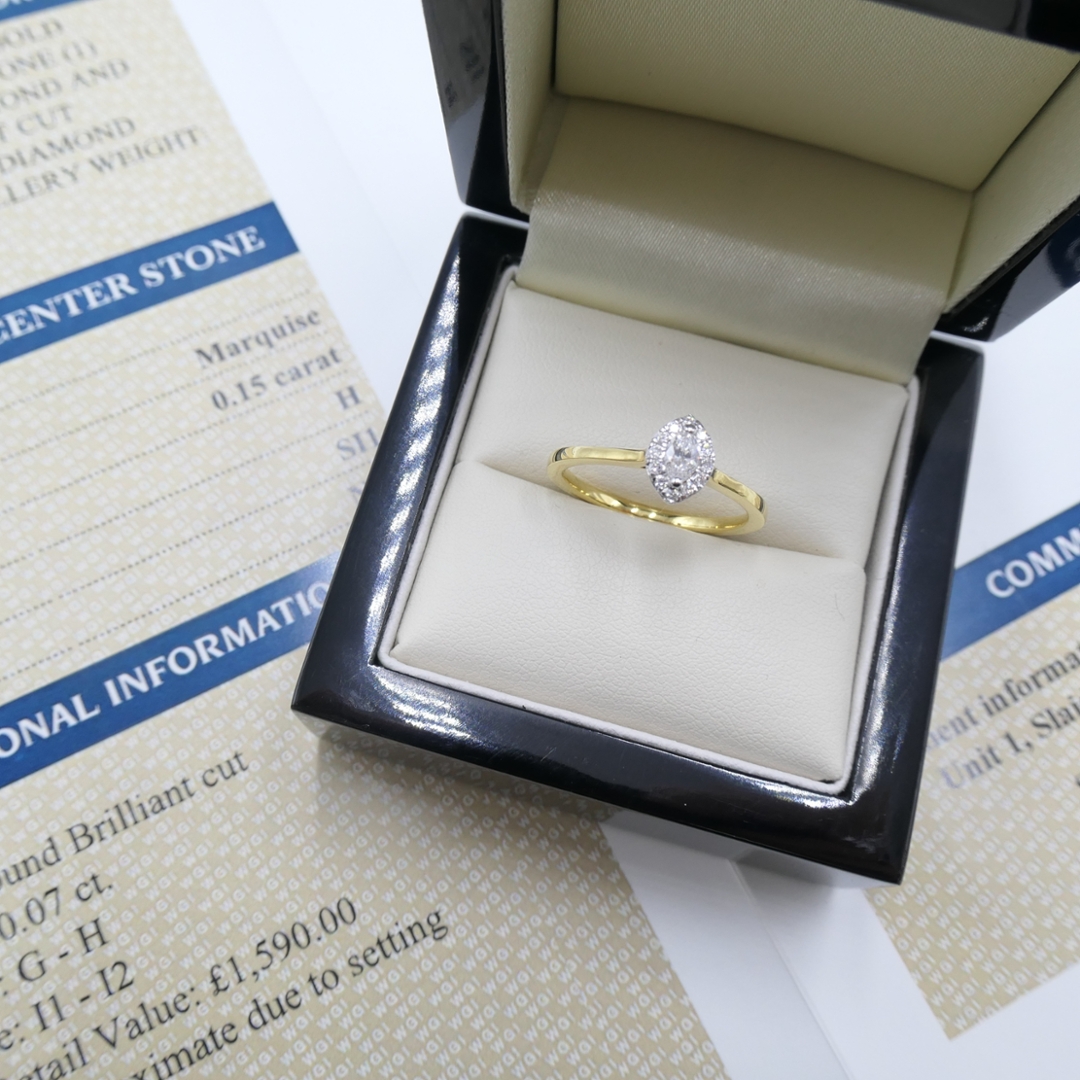 A brand-new, unused, certified natural diamond solitaire engagement ring, this elegant piece combines classic charm with refined craftsmanship. At its centre lies a delicate 0.15-carat marquise-cut natural diamond, graded H in colour and SI1 in clarity, radiating a graceful sparkle that symbolises timeless romance. Surrounding the central stone is a halo of brilliant-cut natural diamonds, with additional diamonds set along the shoulders, totalling 0.07 carats. These accent stones, graded G–H in colour and I1–I2 in clarity, enhance the ring’s brilliance and depth, creating a captivating play of light that brings the entire design to life.