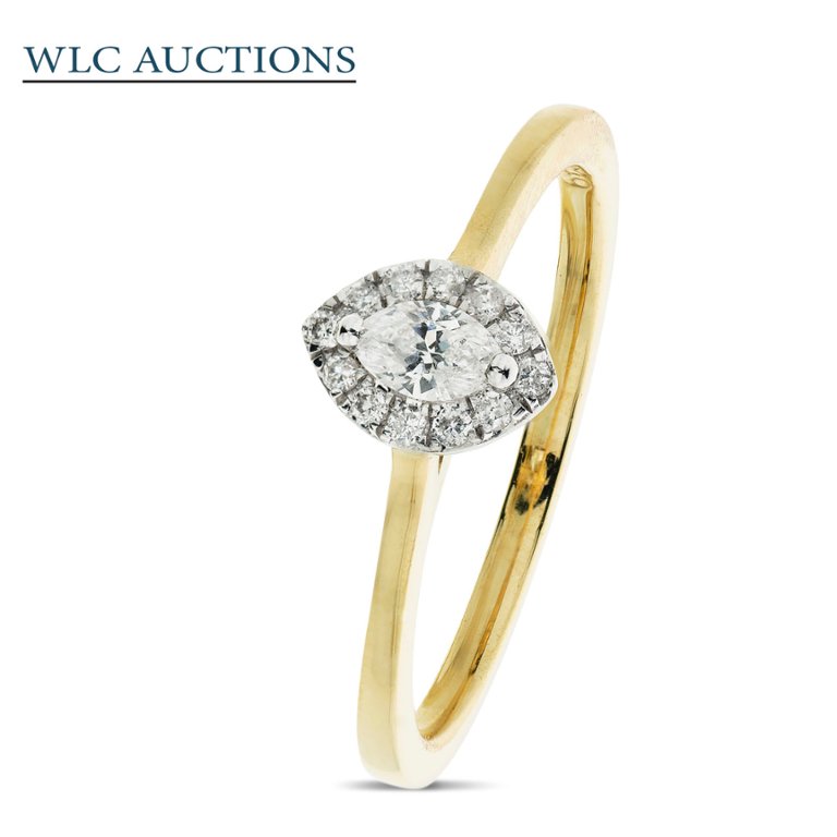 A brand new, unused, certified natural diamond solitaire engagement ring, set with a marquise cut diamond to the centre & a cluster of brilliant cut diamonds in a halo setting, set in 18ct white & yellow gold.
