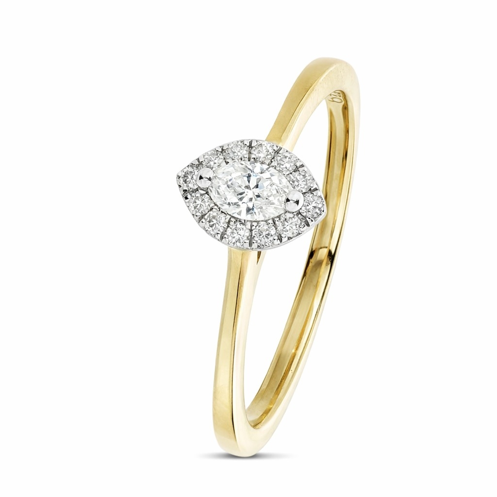 A brand new, unused, certified natural diamond marquise-shaped cluster ring, set with one marquise cut diamond to the centre & a cluster of brilliant-cut diamonds in a halo setting, set in 18ct yellow & white gold.