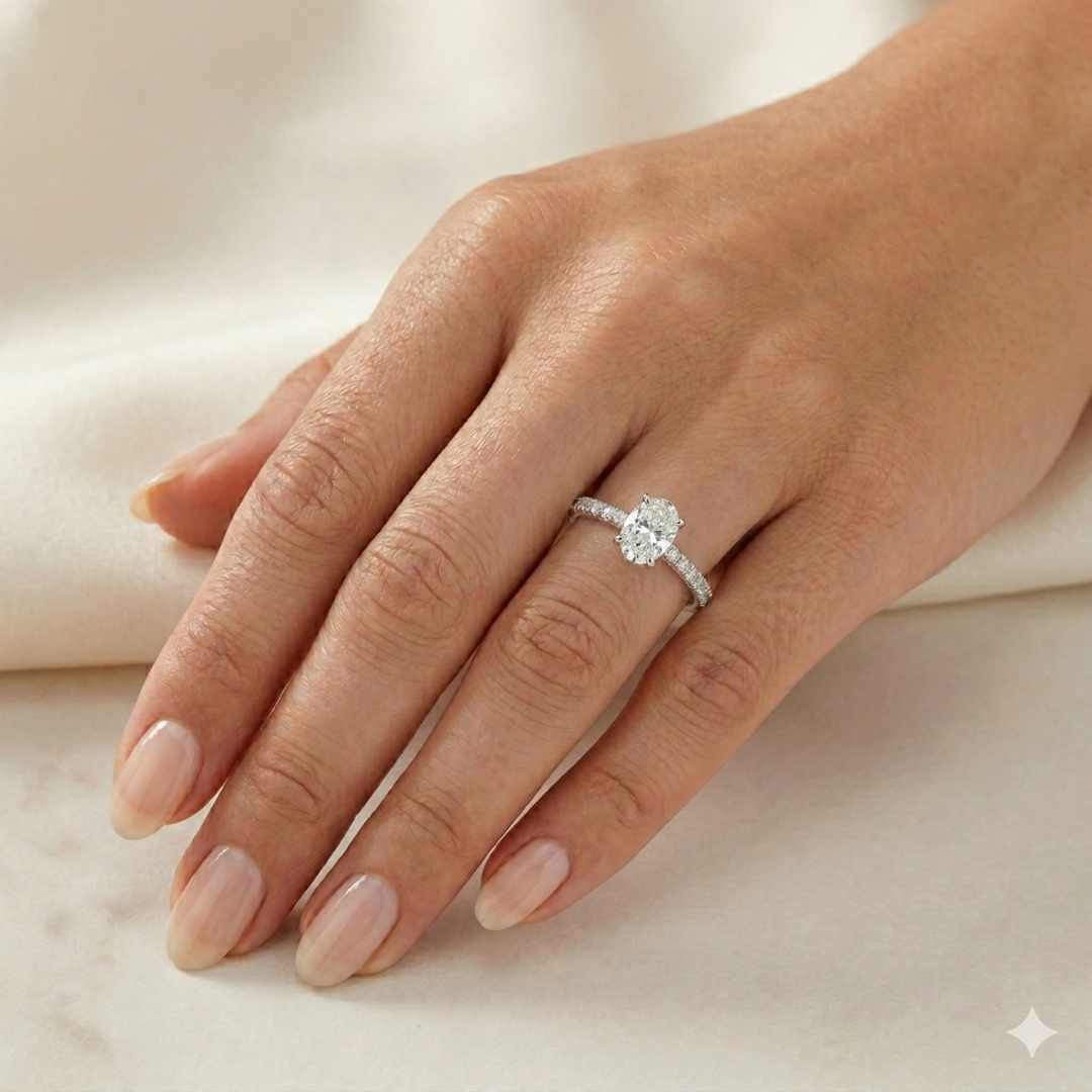 A brand-new, unused certified natural diamond solitaire engagement ring showcasing timeless elegance and refined craftsmanship. At its heart rests a stunning 1.00-carat oval-cut natural diamond, graded H in colour and SI3 in clarity. Its elongated shape enhances the finger’s natural grace, while the expertly cut facets deliver exceptional brilliance and fire. The central stone is beautifully complemented by a cluster of brilliant-cut diamonds adorning the shoulders, totalling 0.23 carats. Each of these accent stones, graded F–G in colour and VS2–SI1 in clarity, enhances the centre diamond’s radiance with exquisite precision and balance.
