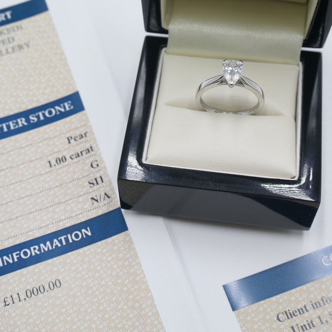 A brand-new, unused certified natural diamond solitaire engagement ring that captures timeless elegance and refined sophistication. At its heart lies a stunning 1.00ct pear-cut natural diamond, graded G in colour and SI1 in clarity, offering a perfect balance of brilliance and purity. The diamond’s graceful shape, with its delicate taper and luminous facets, reflects light beautifully, creating a captivating sparkle with every movement. Expertly set in platinum, a metal renowned for its strength, durability and bright lustre, this ring is designed to endure a lifetime of love and admiration. With a total weight of 4.64 grams and a professional valuation of £11,000, it represents the pinnacle of classic luxury and exceptional craftsmanship.