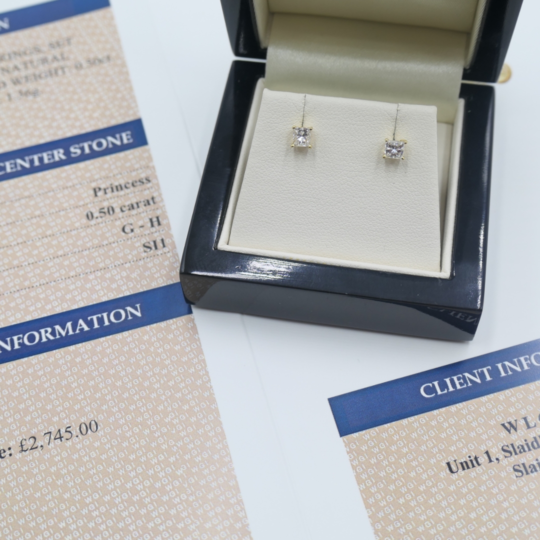 - > Natural Diamond Princess Cut Solitaire Earrings 0.50ct