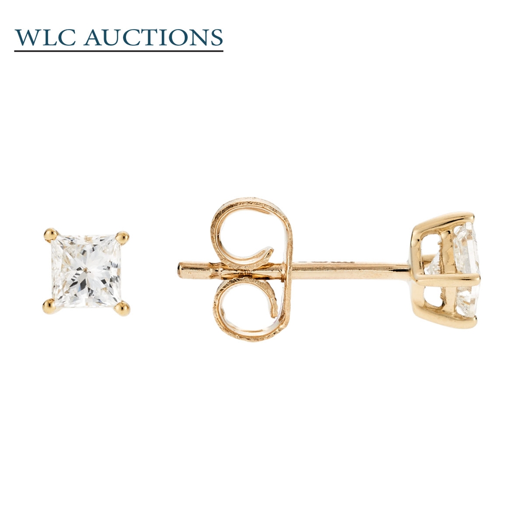 A brand-new, unused, certified pair of natural diamond solitaire earrings, with two princess-cut diamonds, set in 18ct yellow gold.
