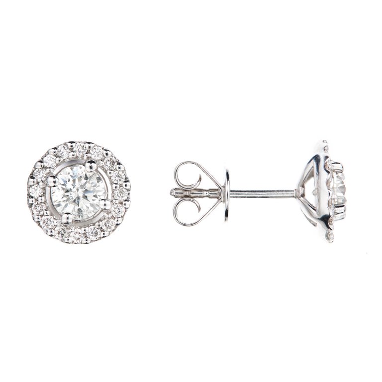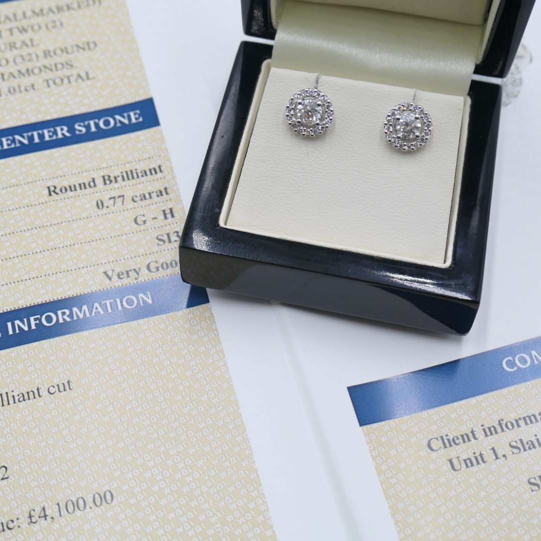 A brand-new, unused certified pair of natural diamond round-shaped cluster earrings that radiate timeless sophistication and captivating brilliance. Each earring features a central round brilliant-cut natural diamond, totalling 0.77 carats across the pair, graded G–H in colour and SI3 in clarity. Surrounding each centre stone is a halo of smaller brilliant-cut diamonds, totalling 0.24 carats, graded G–H in colour and SI1–SI2 in clarity. Together, they create a mesmerising sparkle that catches light from every angle, celebrating the purity, fire, and authenticity that only natural diamonds possess. The beautifully balanced design exudes elegance and refinement, making these earrings an exquisite expression of classic luxury.