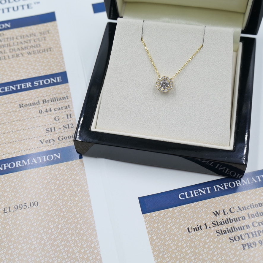 A brand-new, unused certified 18ct yellow gold natural diamond round-shaped cluster pendant, beautifully designed with one central brilliant-cut diamond surrounded by a halo of smaller stones, totalling 0.44 carats. Each diamond is expertly graded G–H in colour and SI1–SI2 in clarity, offering an impressive sparkle that complements the warmth of yellow gold. The halo arrangement enhances the visual size and radiance of the central diamond, creating an eye-catching piece that combines timeless style with exceptional craftsmanship.