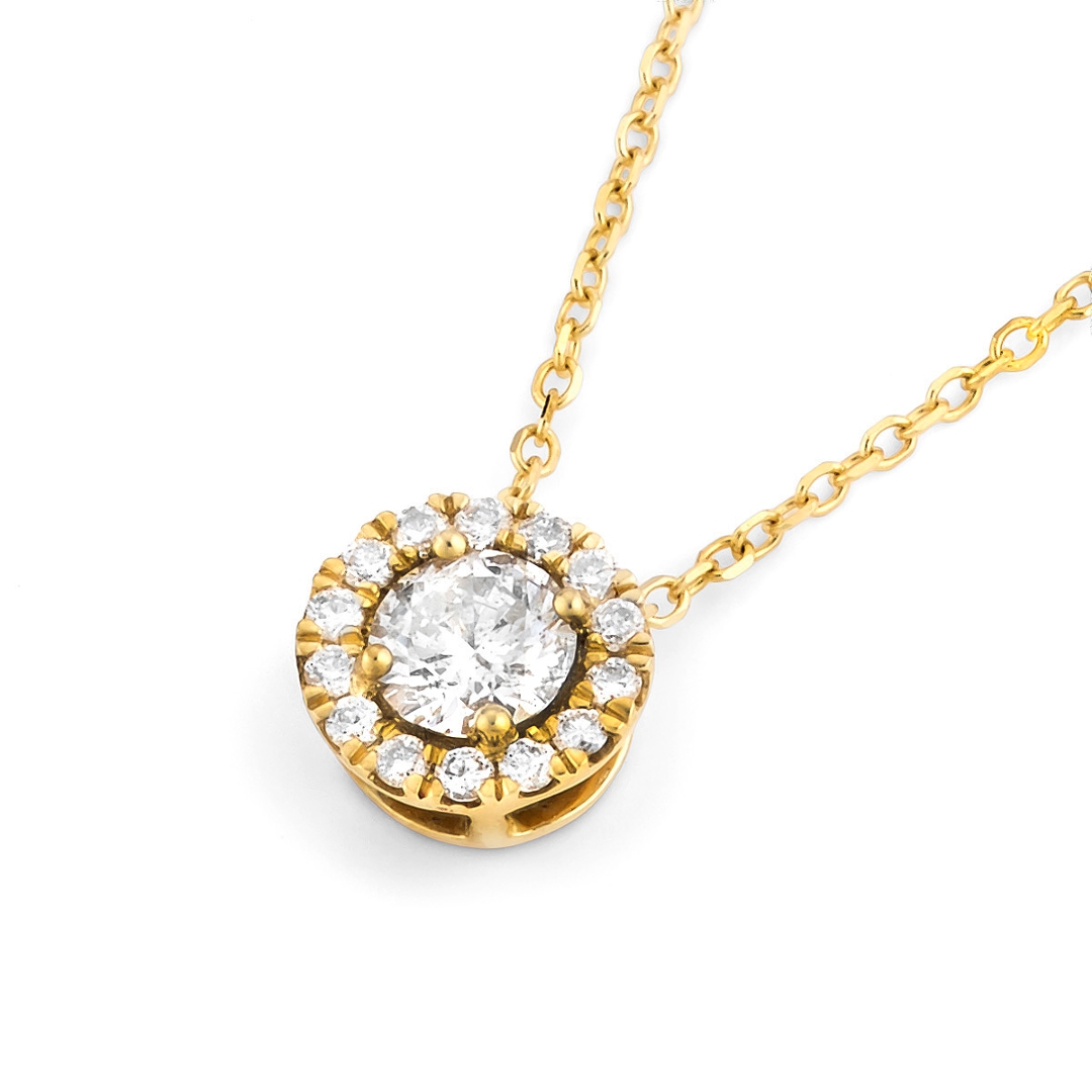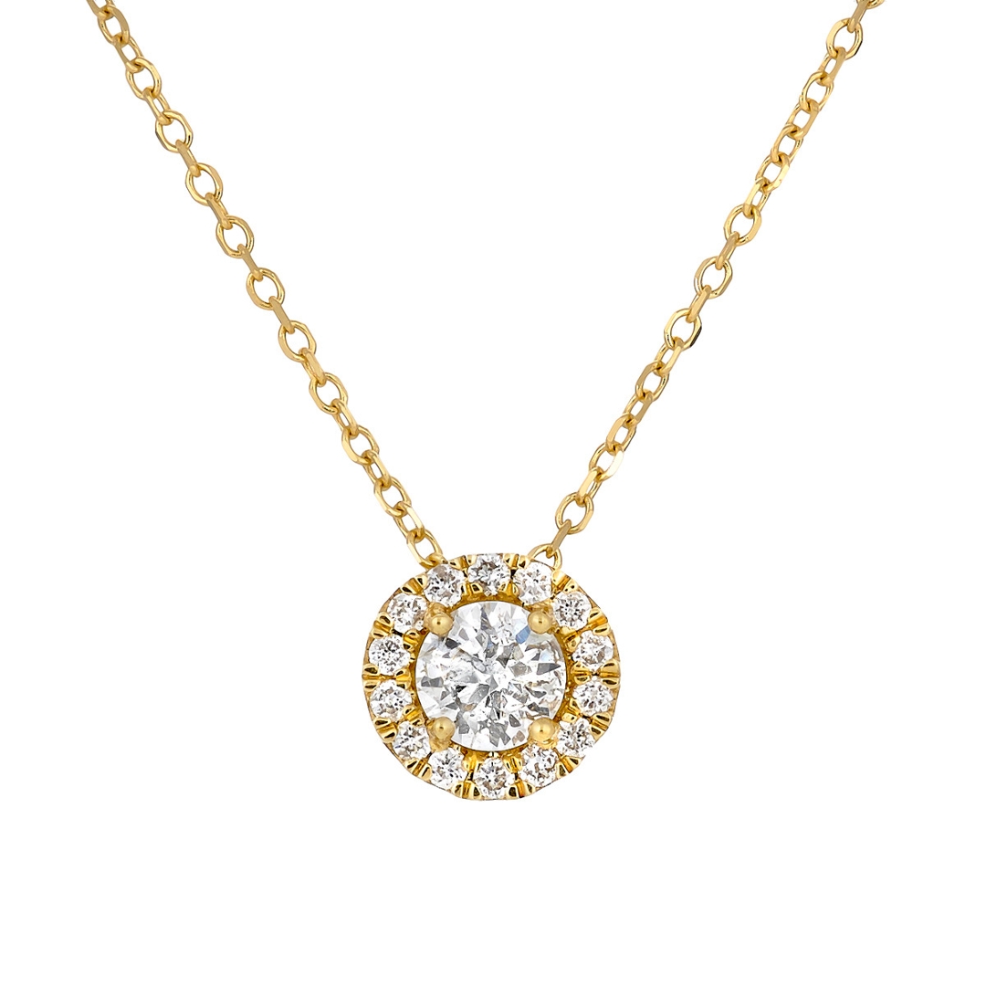 p>A brand-new, unused, certified natural diamond round-shaped cluster pendant, with one brilliant cut diamond to the centre & a cluster of brilliant cut diamonds in a halo setting, set in 18ct yellow gold.