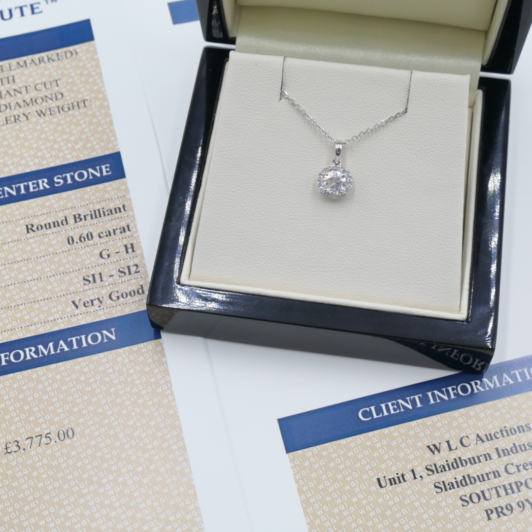 A brand-new, unused certified 18ct white gold pendant featuring a stunning round-shaped cluster design, showcasing a central brilliant-cut natural diamond surrounded by a halo of complementary stones. The total diamond weight of 0.60 carats creates an exquisite display of light and radiance, with each stone carefully positioned to maximise brilliance and symmetry. Graded G–H in colour and SI1–SI2 in clarity, these natural diamonds possess a lively sparkle that contrasts beautifully against the cool tone of white gold, resulting in a piece that is both timeless and captivating.