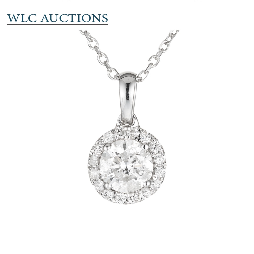 A brand-new, unused, certified 18ct white gold natural diamond round-shaped cluster pendant, set with one brilliant cut diamond to the centre & a cluster of brilliant cut diamonds in a halo setting.