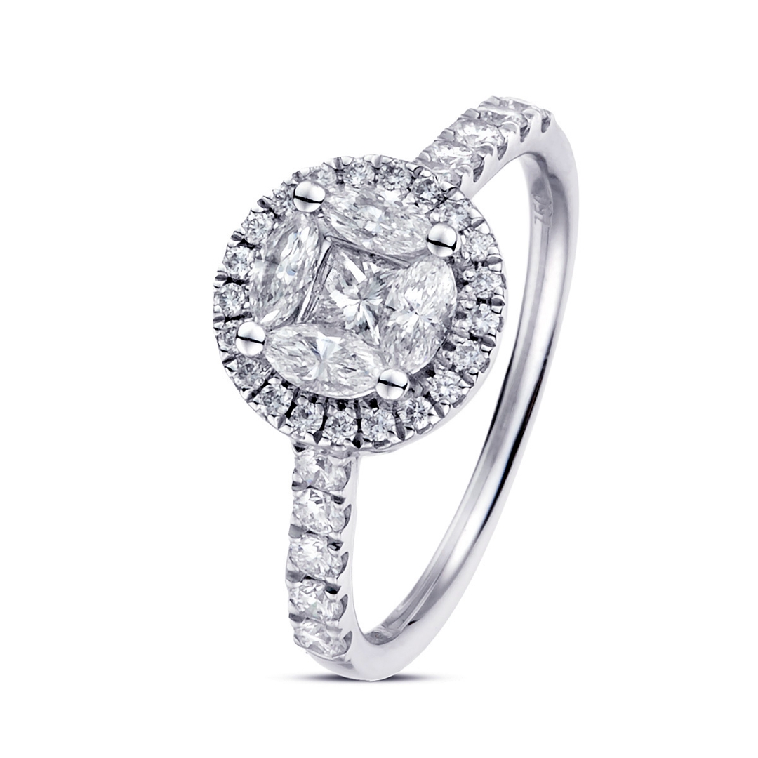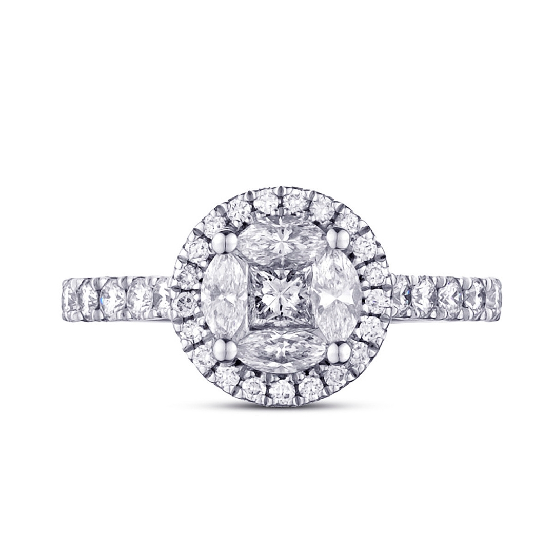 A brand new, unused, certified natural diamond, round-shaped cluster ring, set with brilliant cut, princess cut & marquise cut diamonds, set in platinum.