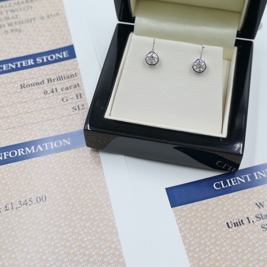 A brand new, unused certified pair of natural diamond solitaire earrings that exude refined beauty, sophistication and lasting elegance. Each earring is set with a brilliant-cut natural diamond, totalling 0.41ct, radiating exceptional sparkle and life. The diamonds are graded G–H in colour and SI2 in clarity, offering a captivating balance of brilliance and purity that catches the light from every angle. Crafted in 9ct white gold, the cool, polished finish enhances the diamonds’ crisp luminosity, giving the design a timeless, contemporary appeal. With a total weight of 0.89 grams and a professional valuation of £1,345, these earrings embody understated luxury and masterful craftsmanship.